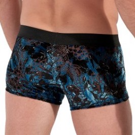 Die kurzen Herrenboxershorts von Fremont sind ein wahres stilistisches Statement. Aus verschlungenem Samt gefertigt, bietet es eine üppige Textur und eine sinnliche Note von seltener Intensität. Sein weiches, leicht glänzendes Material fängt das Licht ein und erinnert an die hellen Neonlichter der Fremont Street in Las Vegas. Mit einem elastischen Schleier, der im Saum des Unterschenkels für optimalen Halt eingesetzt ist, verfügt er über einen breiten HOM-Gürtel, der mit einem Lulex-Faden verstärkt wird, was seinen luxuriösen Charakter unterstreicht. Die barocken Muster, die in das Material eingewoben sind, unterstreichen den glamourösen und opulenten Geist dieses einzigartigen Herrenstücks. Der Fremont ist ein kurzer Boxer, der für Liebhaber eleganter Dessous entworfen wurde, bei dem Komfort auf Verführung trifft.
