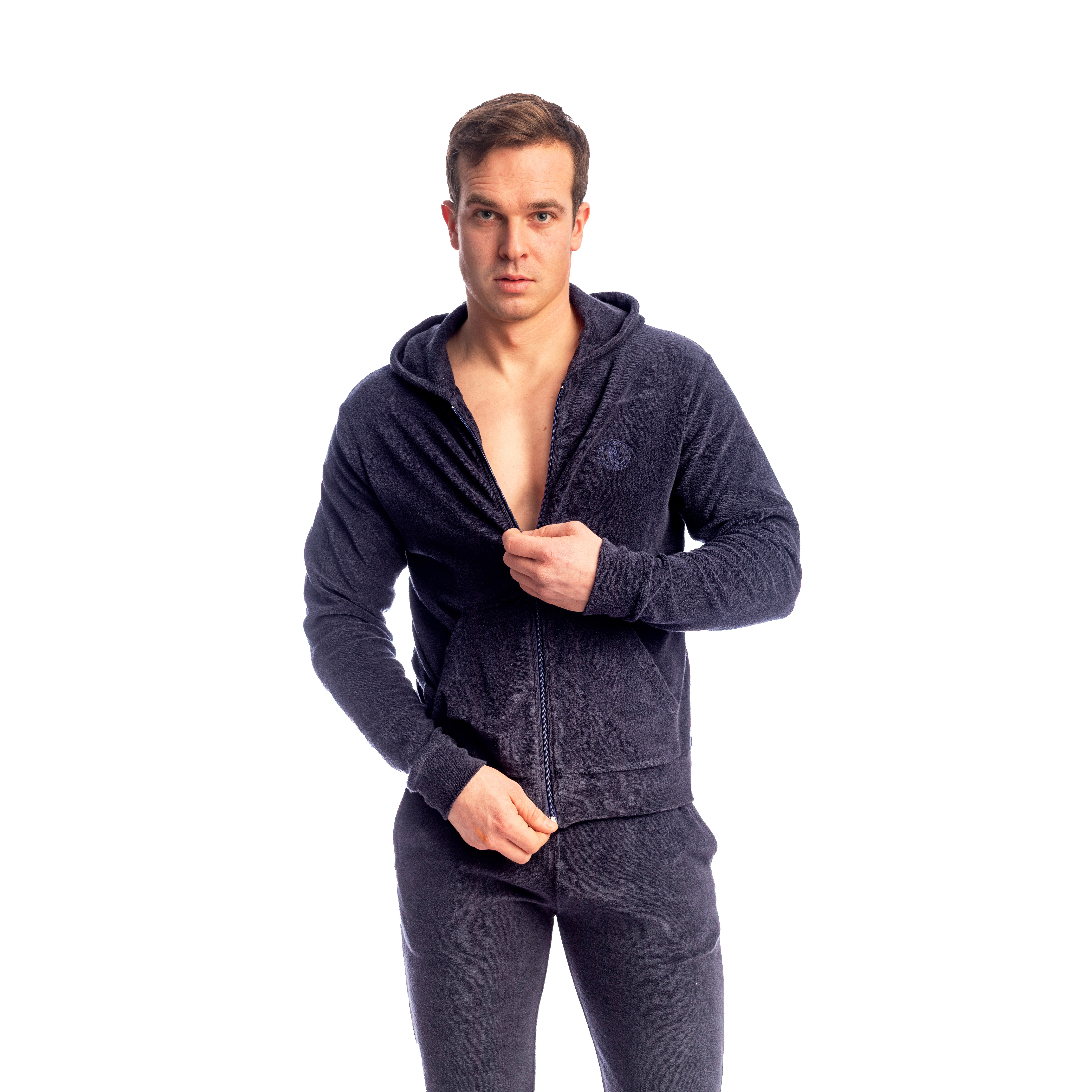 Reißverschluss-Hoodie aus marineblauem Frottee, weich und edel. Schmal, doppelter Reißverschluss.