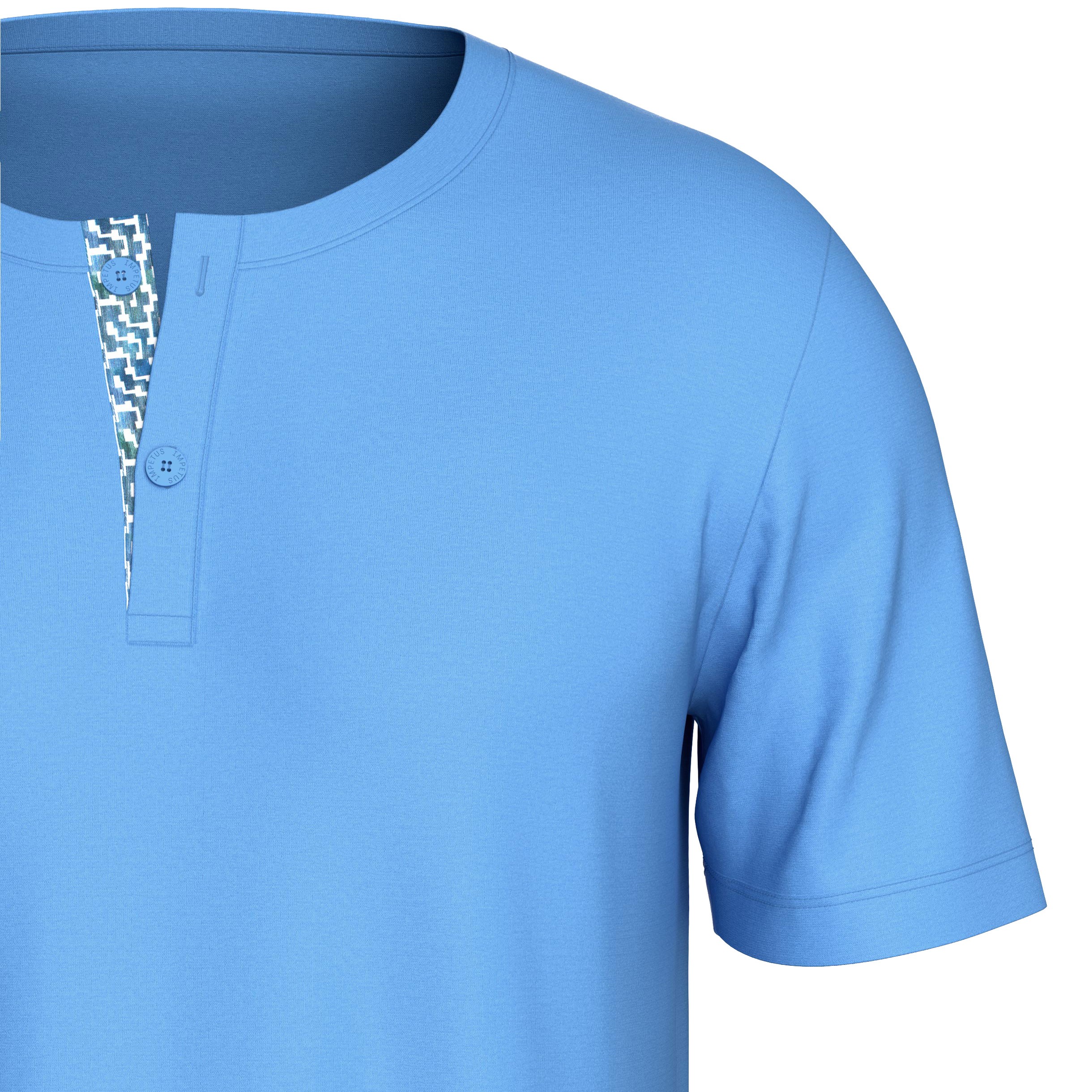 Das T-Shirt hat einen geraden Schnitt mit kurzen Ärmeln und einen tunesischen Kragen mit zwei Knöpfen, es setzt sich harmonisch mit dem Schnitt der Shorts fort.