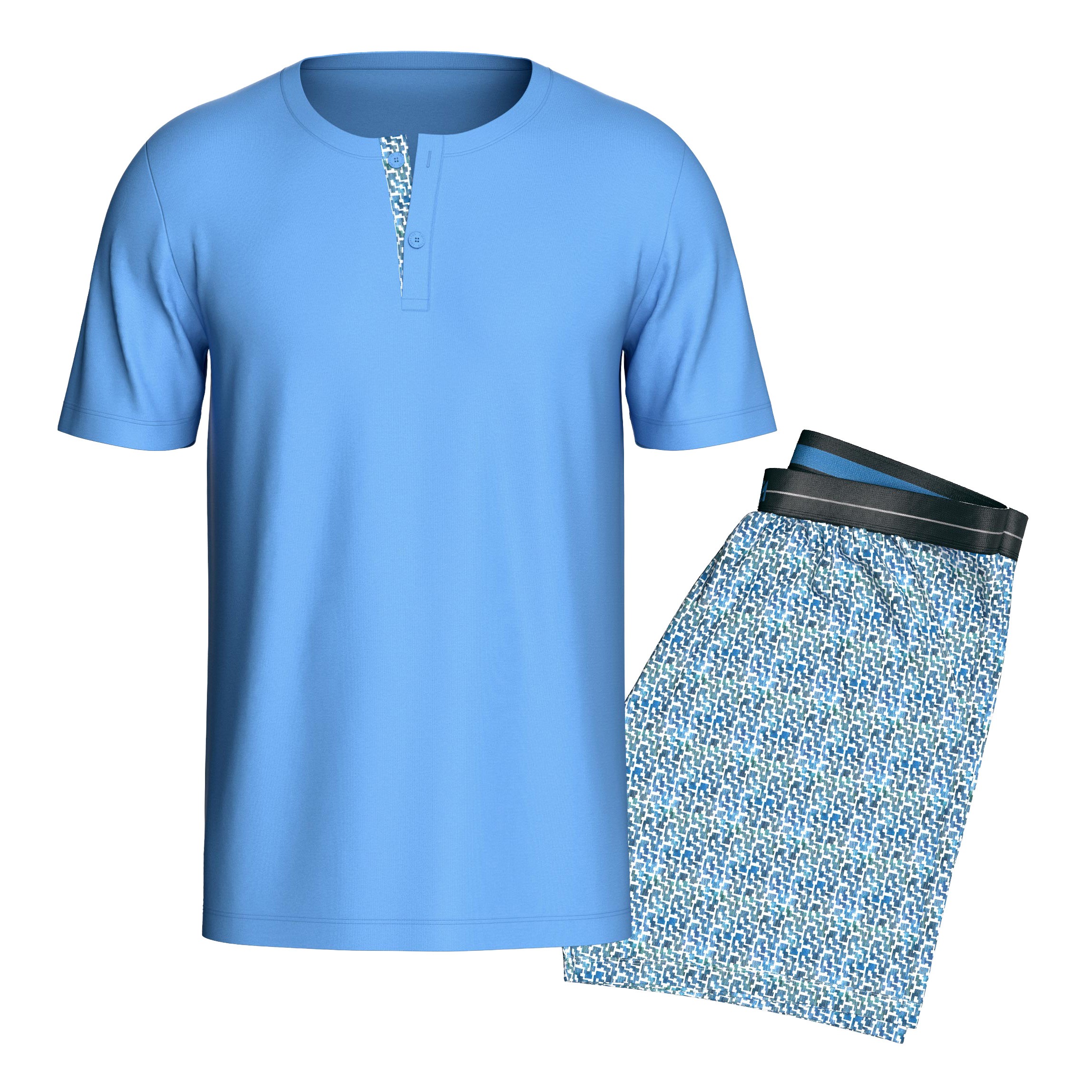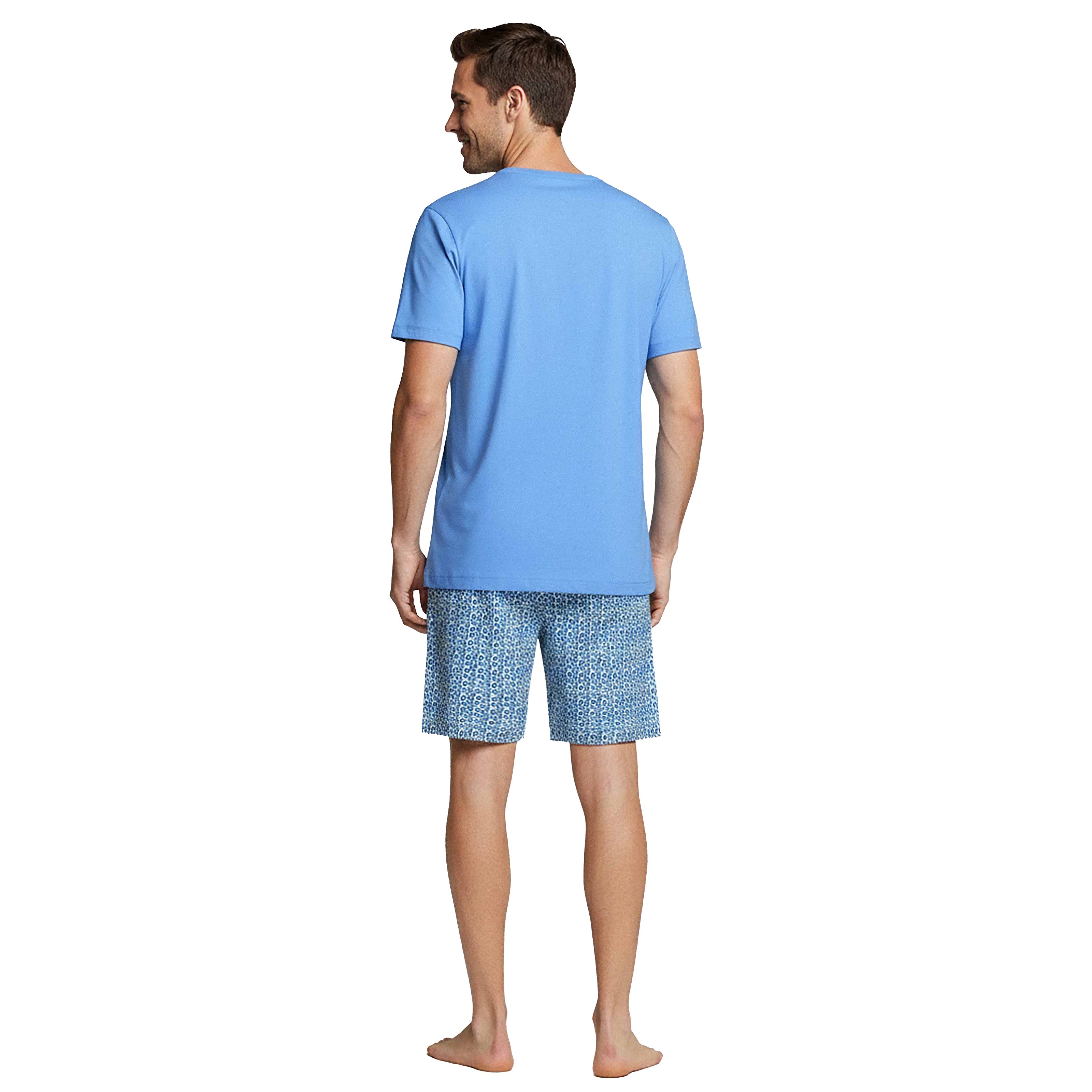 Die NIOLON HOM Kurzpyjamas sind ein Set aus Herrenpyjamas aus 100% Baumwolljersey in Blau- und Weißtönen. Es besteht aus einem kurzärmeligen Rundhals-Pyjama-T-Shirt und einer passenden Shorts.