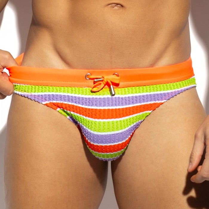 Es collection's slip de bain Sportive retoma los colores del maillot deportivo de corte deportivo y los colores dinámicos y contrastantes.