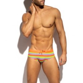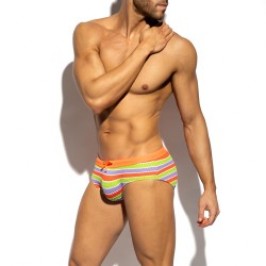 Es collection's slip de bain Sportive retoma los colores del maillot deportivo de corte deportivo y los colores dinámicos y contrastantes.