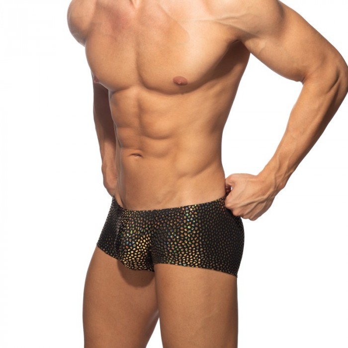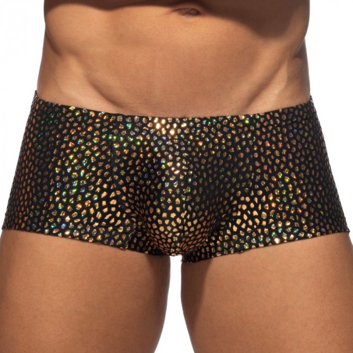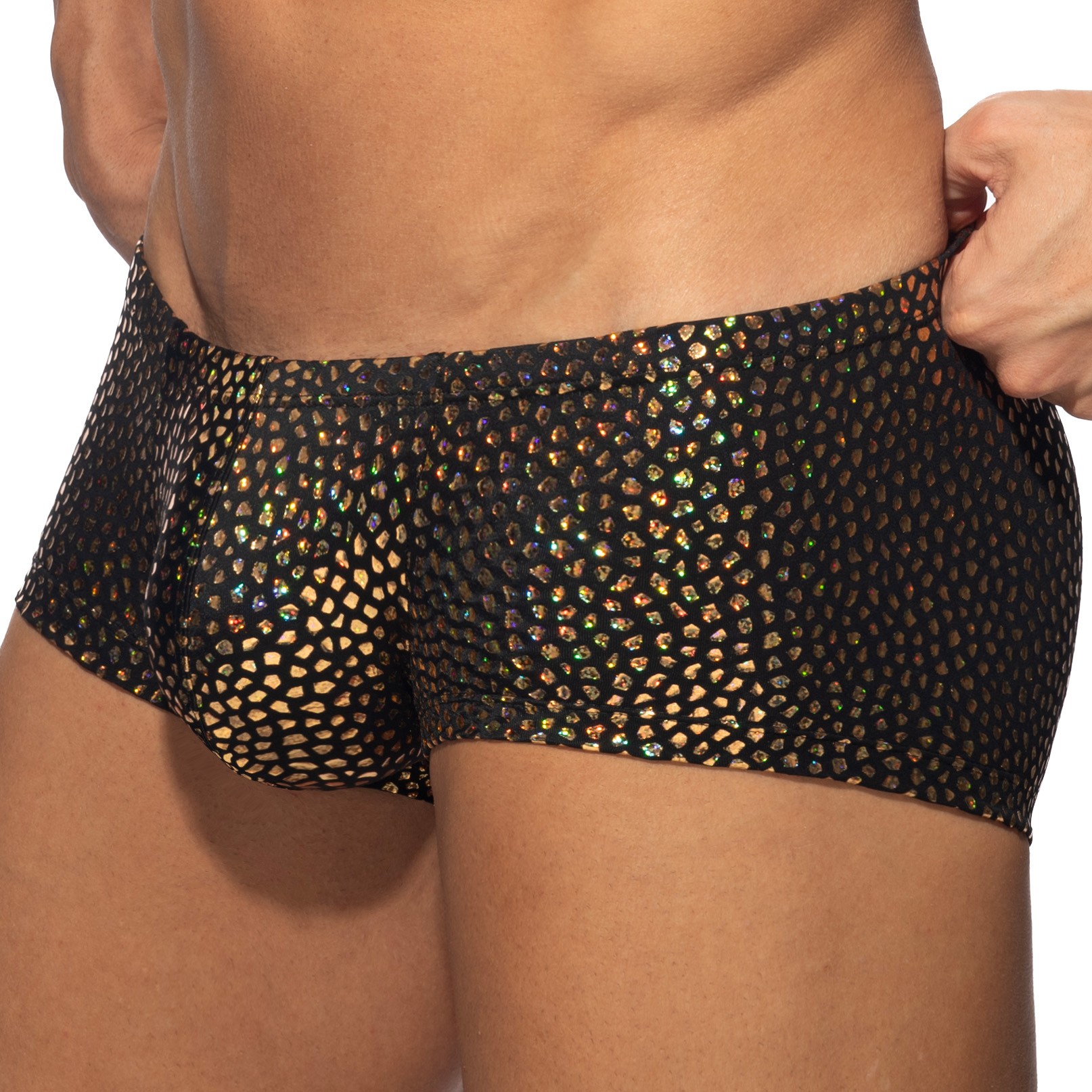 Tócame. Soy preciosa. ¿Mineral? No, mayor... ¡Peso pesado en cuanto a ropa interior glamurosa! Exquisitos slips de bikini para fiesta que tienen un efecto laminado dorado y brillante por toda la superficie. Es un placer táctil sostener estas piedras en la mano - extremadamente suaves y cómodas mientras reflejas todas las luces del club. Material ligeramente elástico, pero con amplio espacio en los bolsillos delanteros para tus propias piedras.