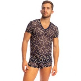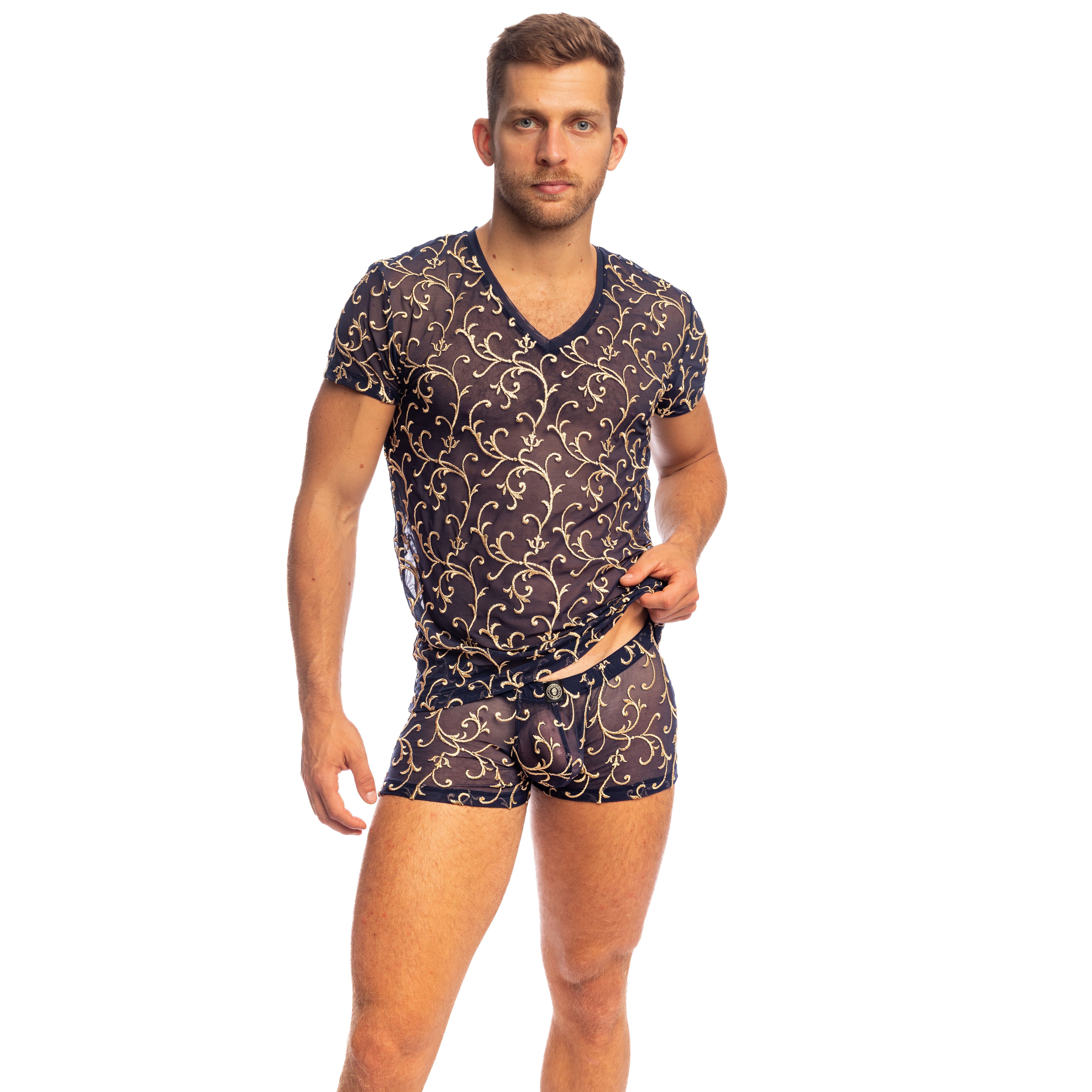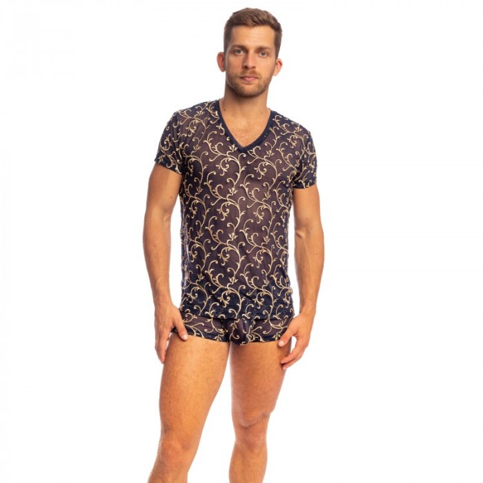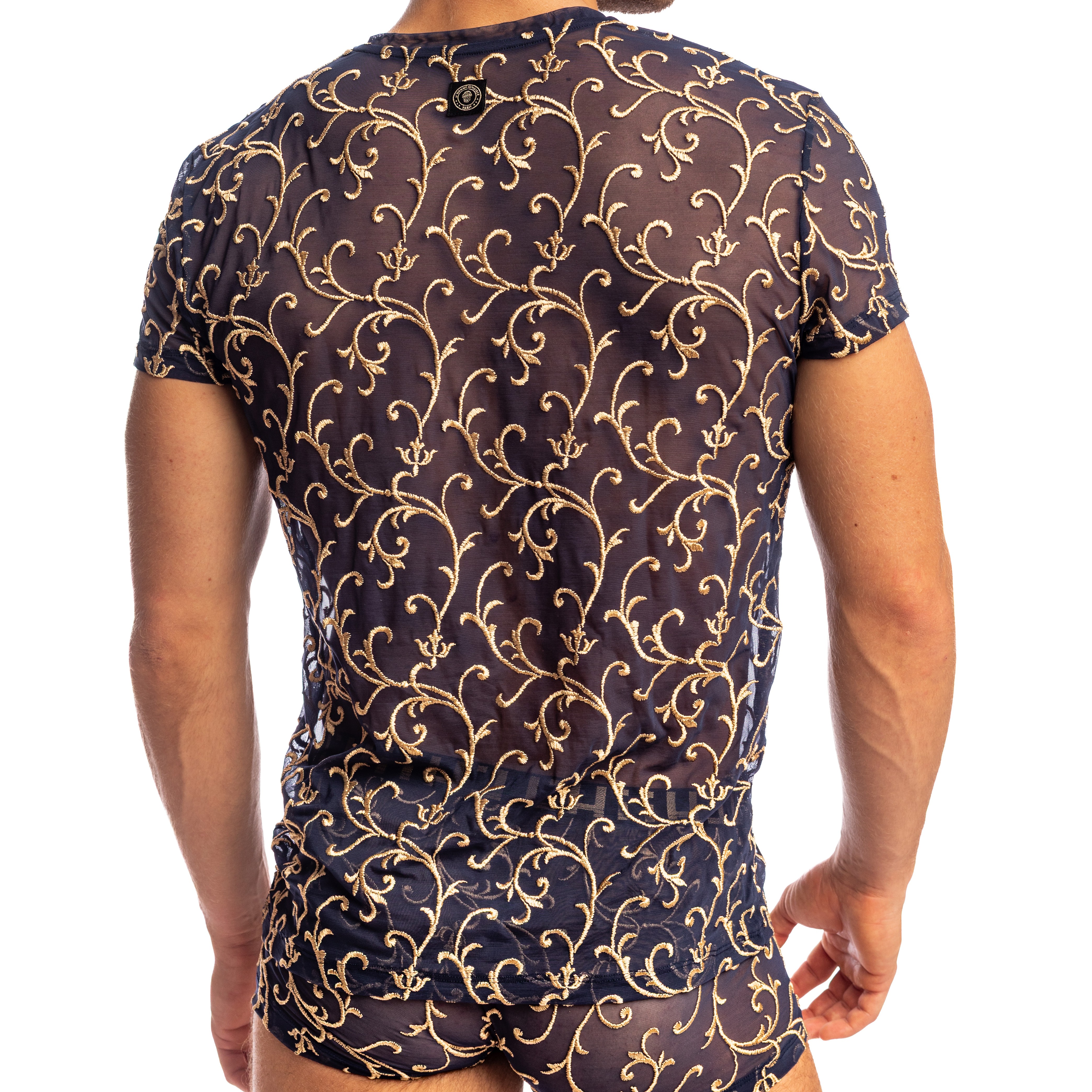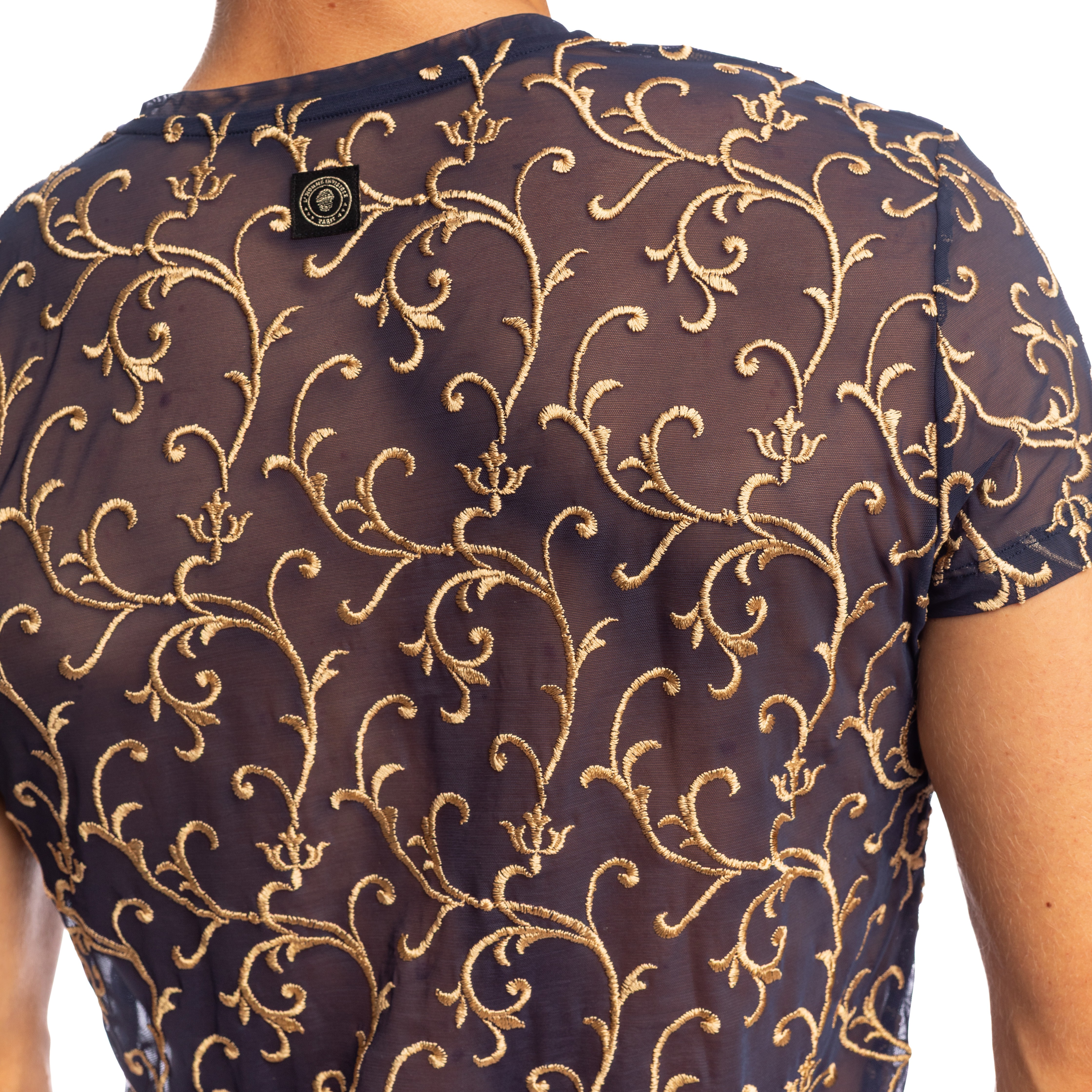 El bordado capta la luz, los reflejos dorados bailan sobre el azul profundo: la transparencia se convierte en adorno. Una majestuosa camiseta de seducción, diseñada para el hombre libre, audaz y seguro de sí mismo.