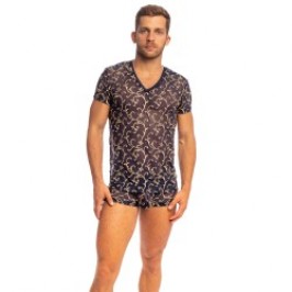 Camiseta de hombre sensual y erótica de encaje fino adornada con un magnífico motivo floral muy moderno. ¡Un exquisito encaje y un look muy chic!