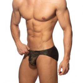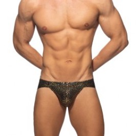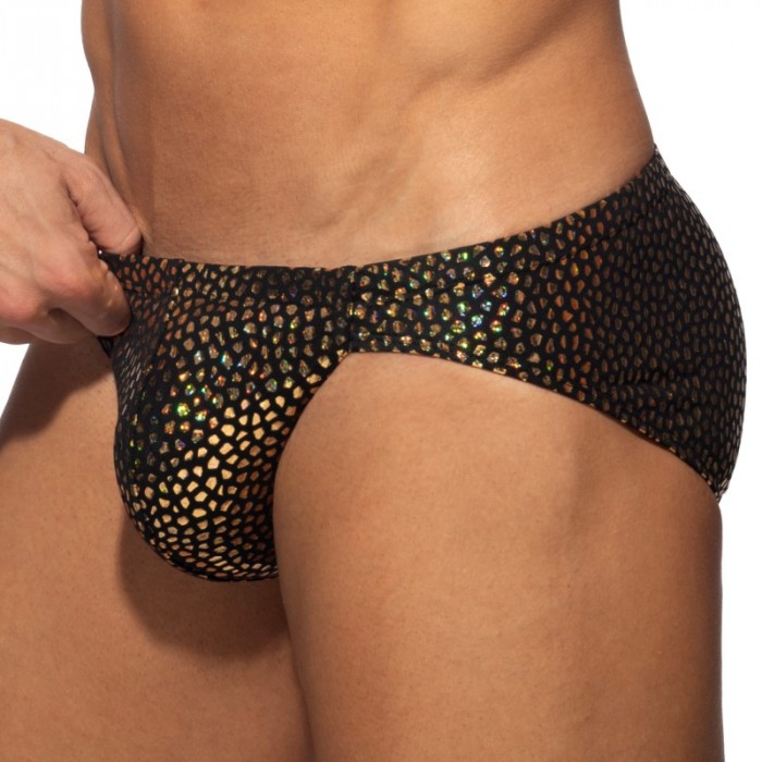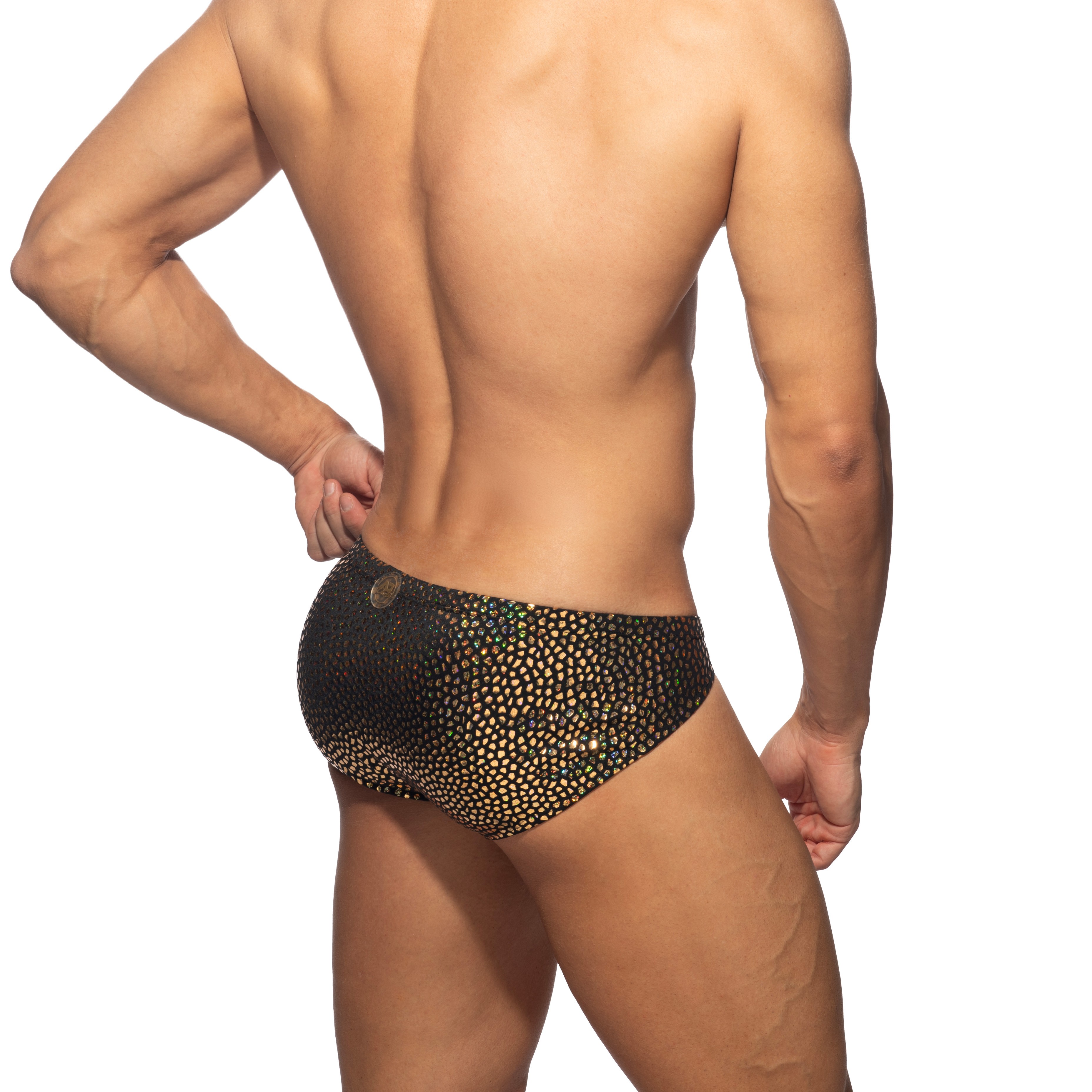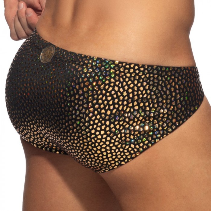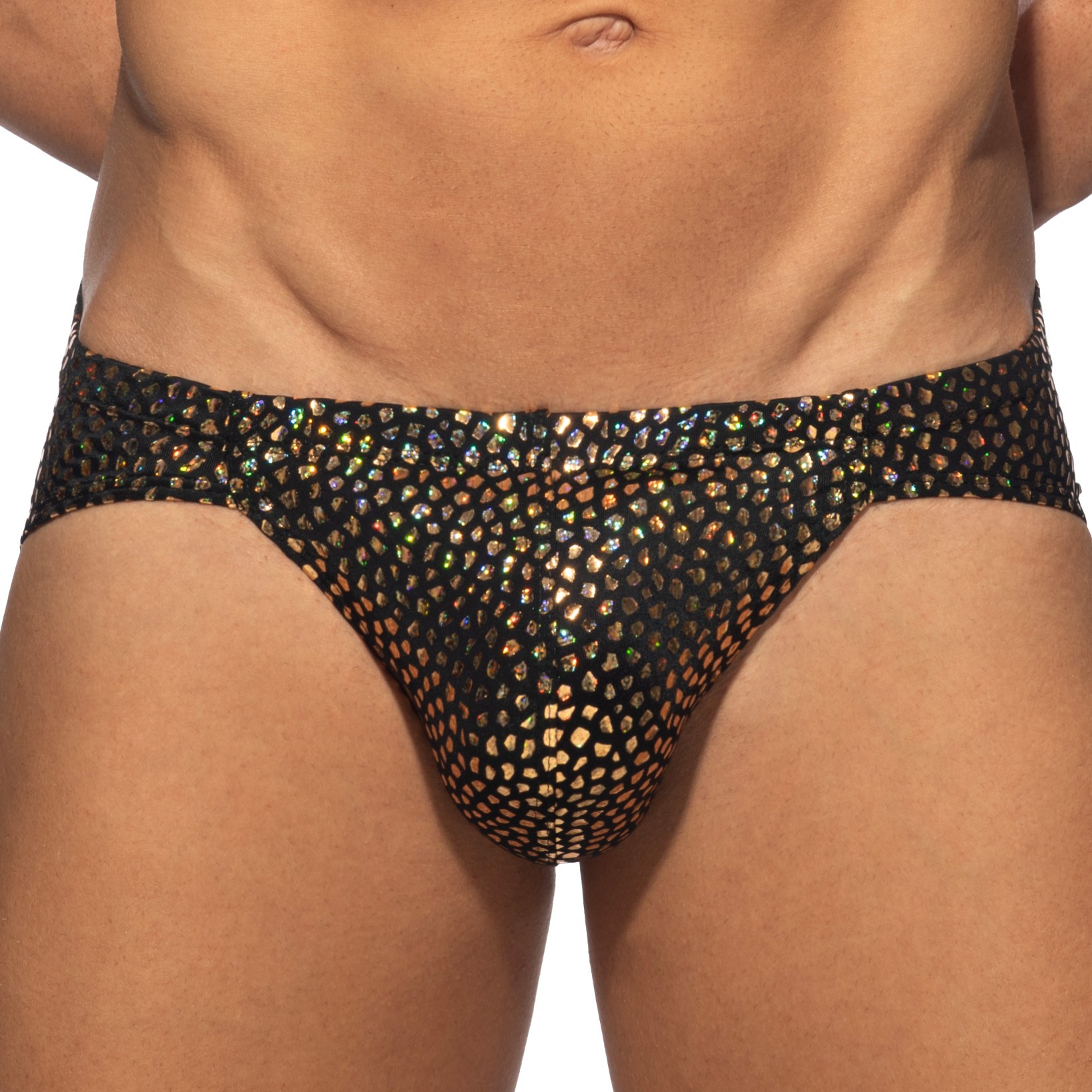 Tócame. Soy preciosa. ¿Mineral? No, mayor... ¡Peso pesado en cuanto a ropa interior glamurosa! Exquisitos slips de bikini para fiesta que tienen un efecto laminado dorado y brillante por toda la superficie. Es un placer táctil sostener estas piedras en la mano - extremadamente suaves y cómodas mientras reflejas todas las luces del club. Material ligeramente elástico, pero con amplio espacio en los bolsillos delanteros para tus propias piedras.