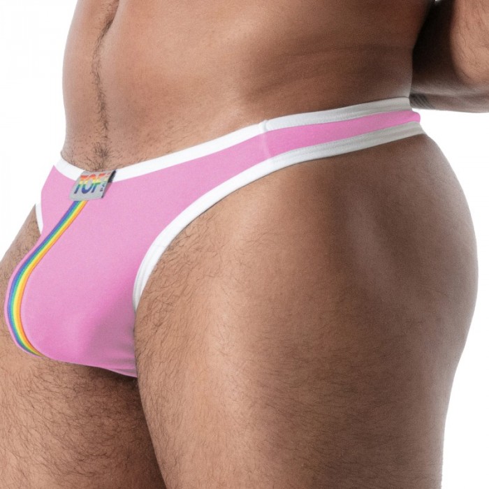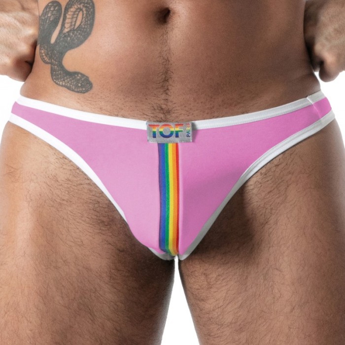"La tanga alegre del orgullo es la quintaesencia del espíritu de TOF París: una mezcla de colores, comodidad y audacia. La franja arcoíris llama la atención de inmediato, el corte está perfectamente diseñado para resaltar el cuerpo y el look atrevido sigue siendo muy elegante. Es una opción ideal descubrir lencería masculina en la versión TOF o enriquecer una colección ya bien surtida.