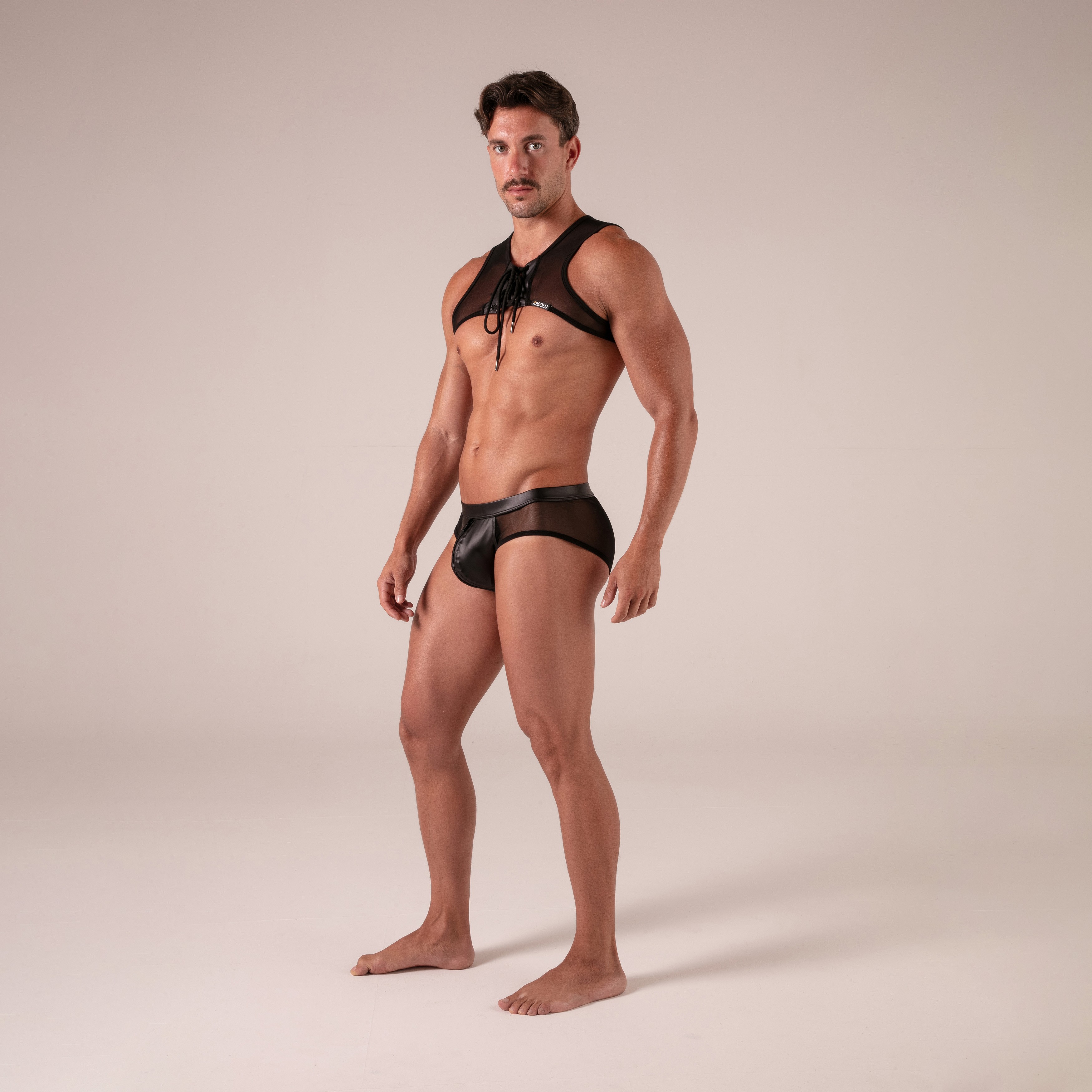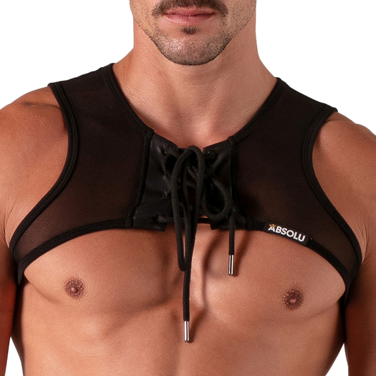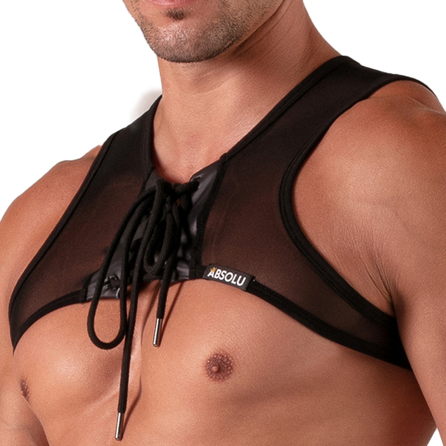 Osez affirmer votre style avec le harnais en maille pour homme rebel d'absolu male . Confectionné dans un subtil mélange de cuir vegan et de maille transparente , ce harnais en maille lacée met en valeur la poitrine tout en laissant entrevoir la peau. Son système de laçage renforce son identité érotique et fétichiste, tandis que la coupe ajustée flatte la silhouette.