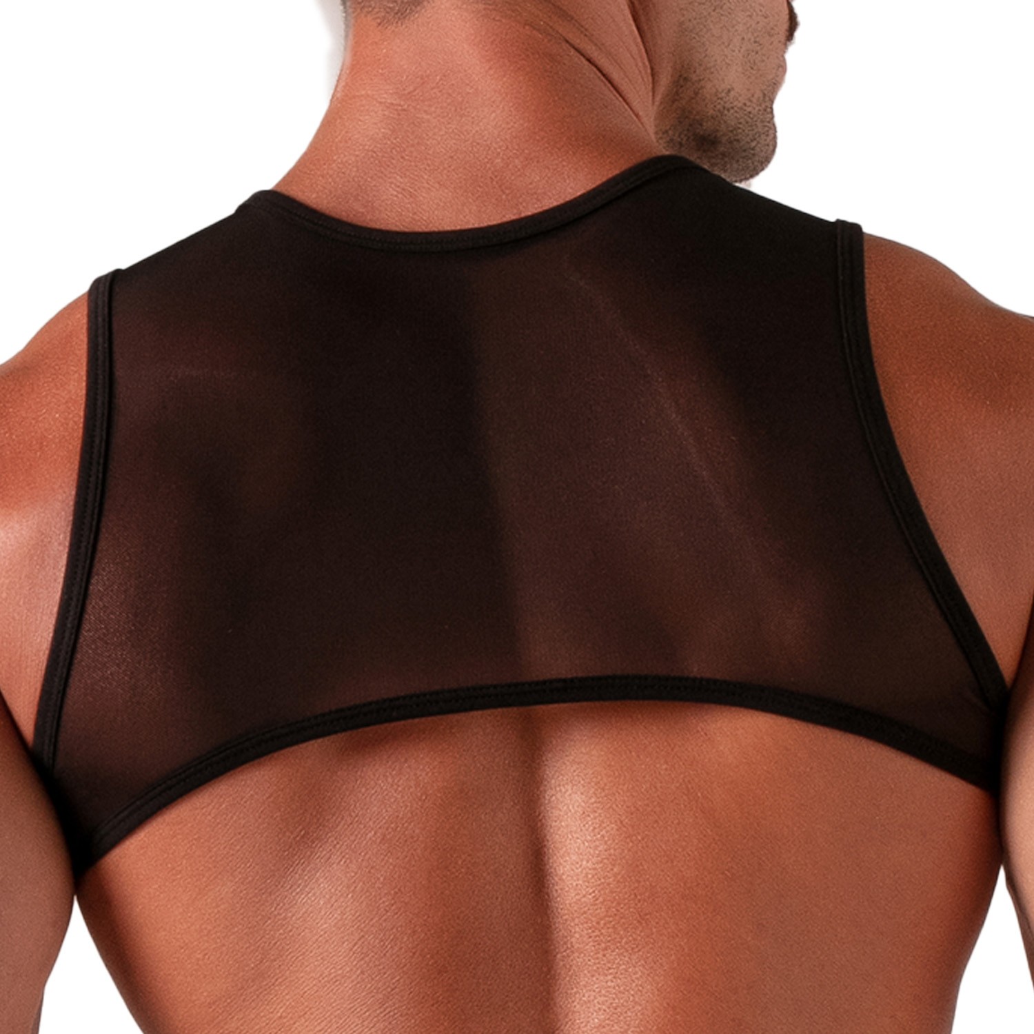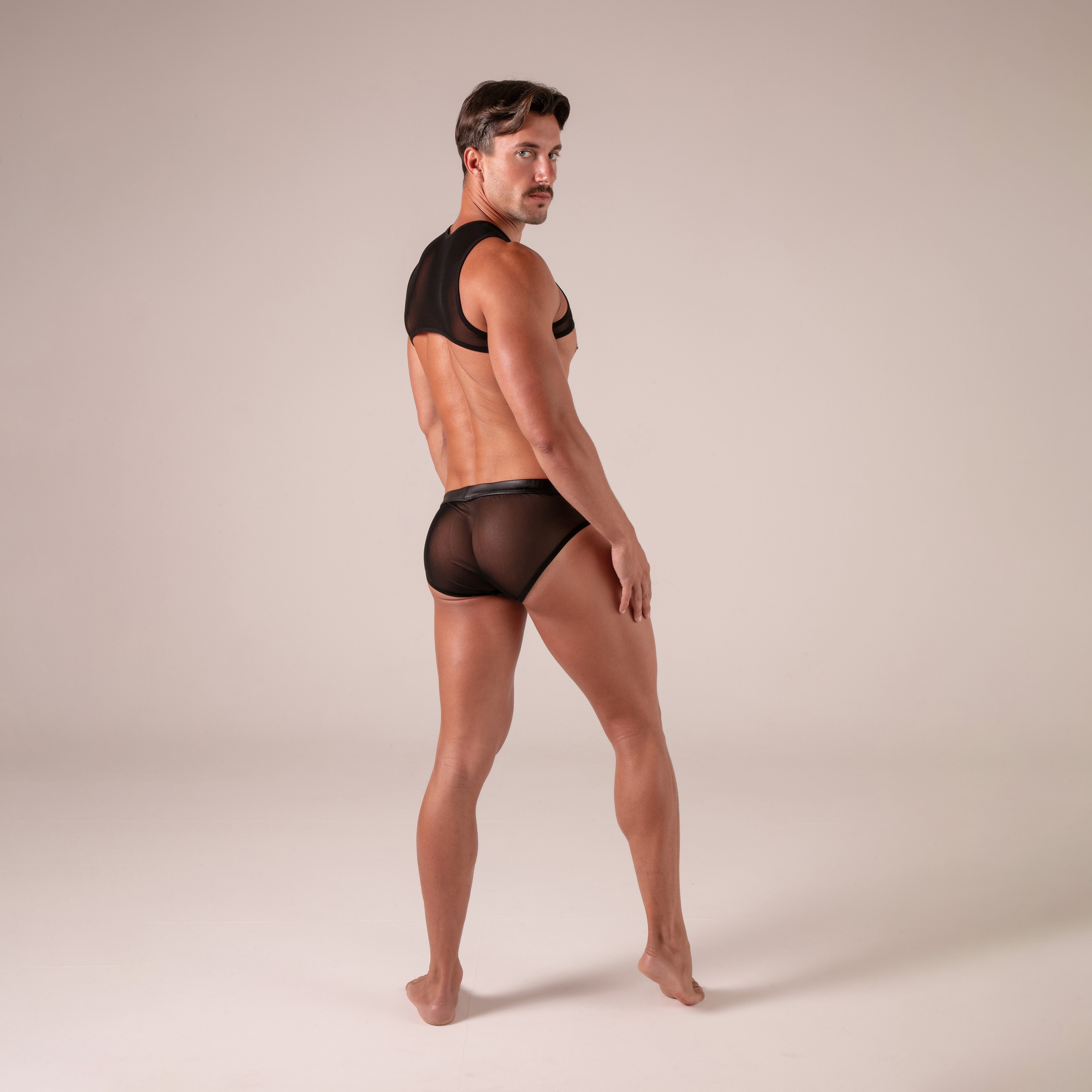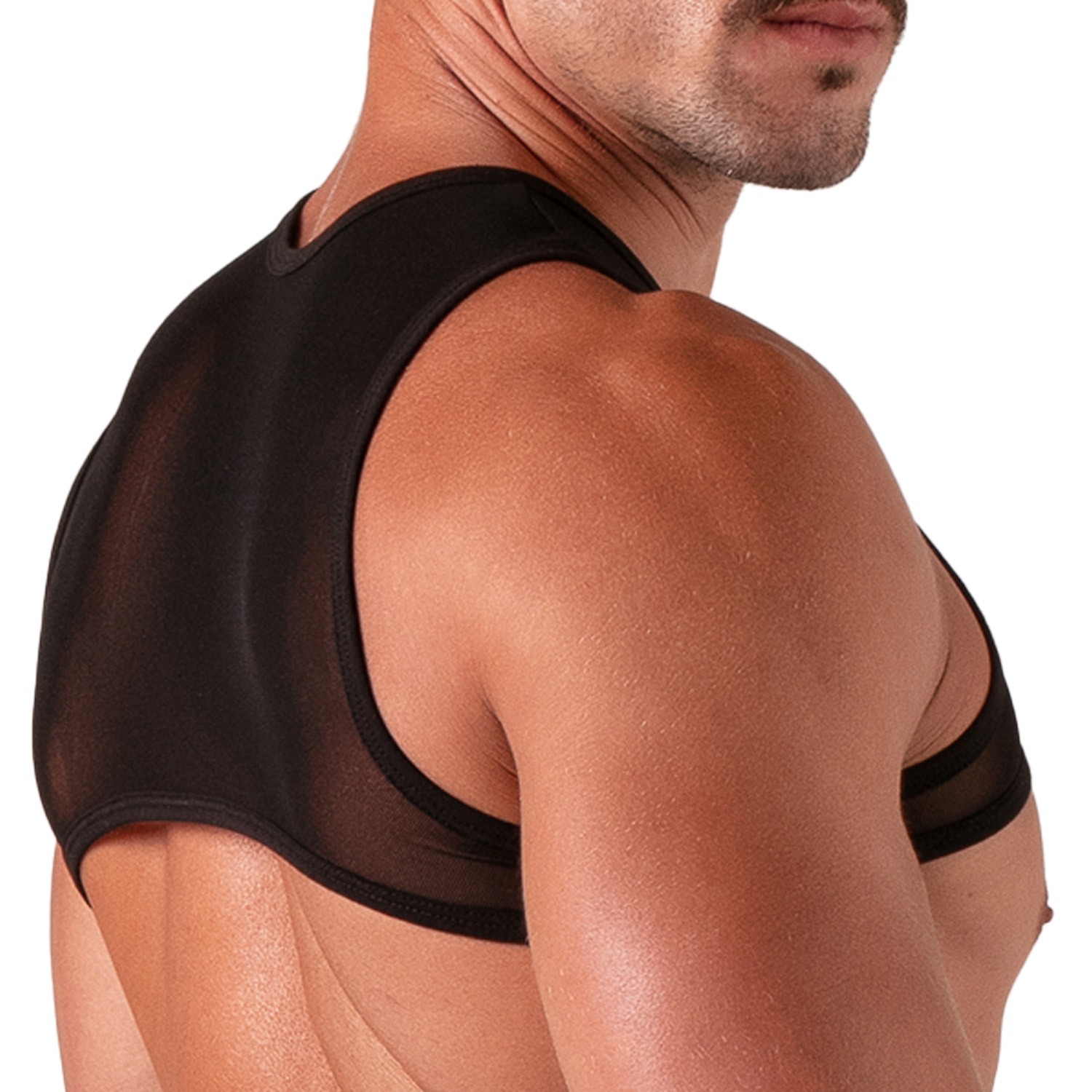 Osez affirmer votre style avec le harnais en maille pour homme rebel d'absolu male . Confectionné dans un subtil mélange de cuir vegan et de maille transparente , ce harnais en maille lacée met en valeur la poitrine tout en laissant entrevoir la peau. Son système de laçage renforce son identité érotique et fétichiste, tandis que la coupe ajustée flatte la silhouette.