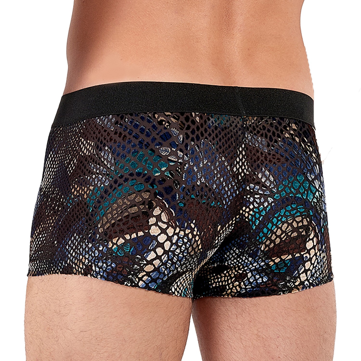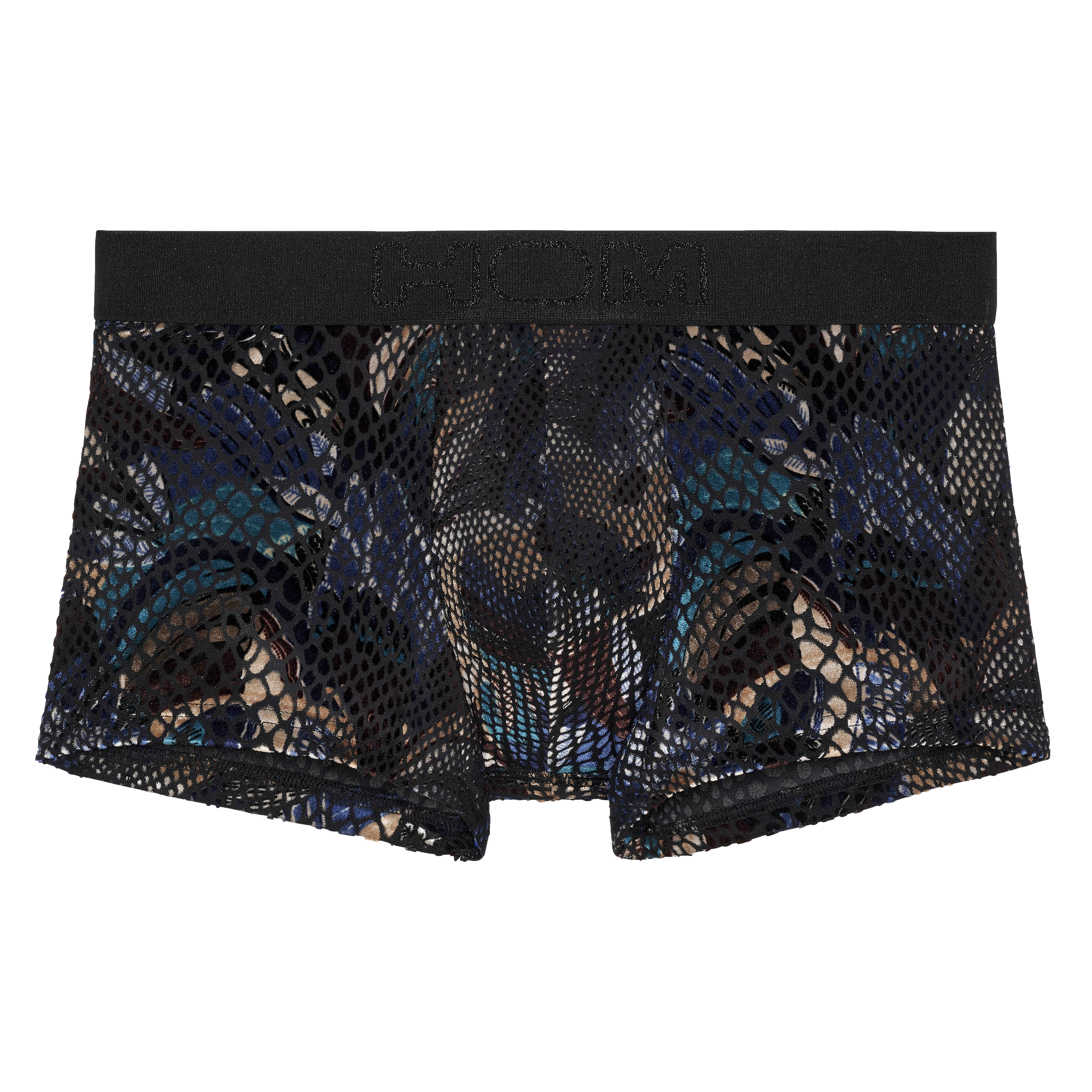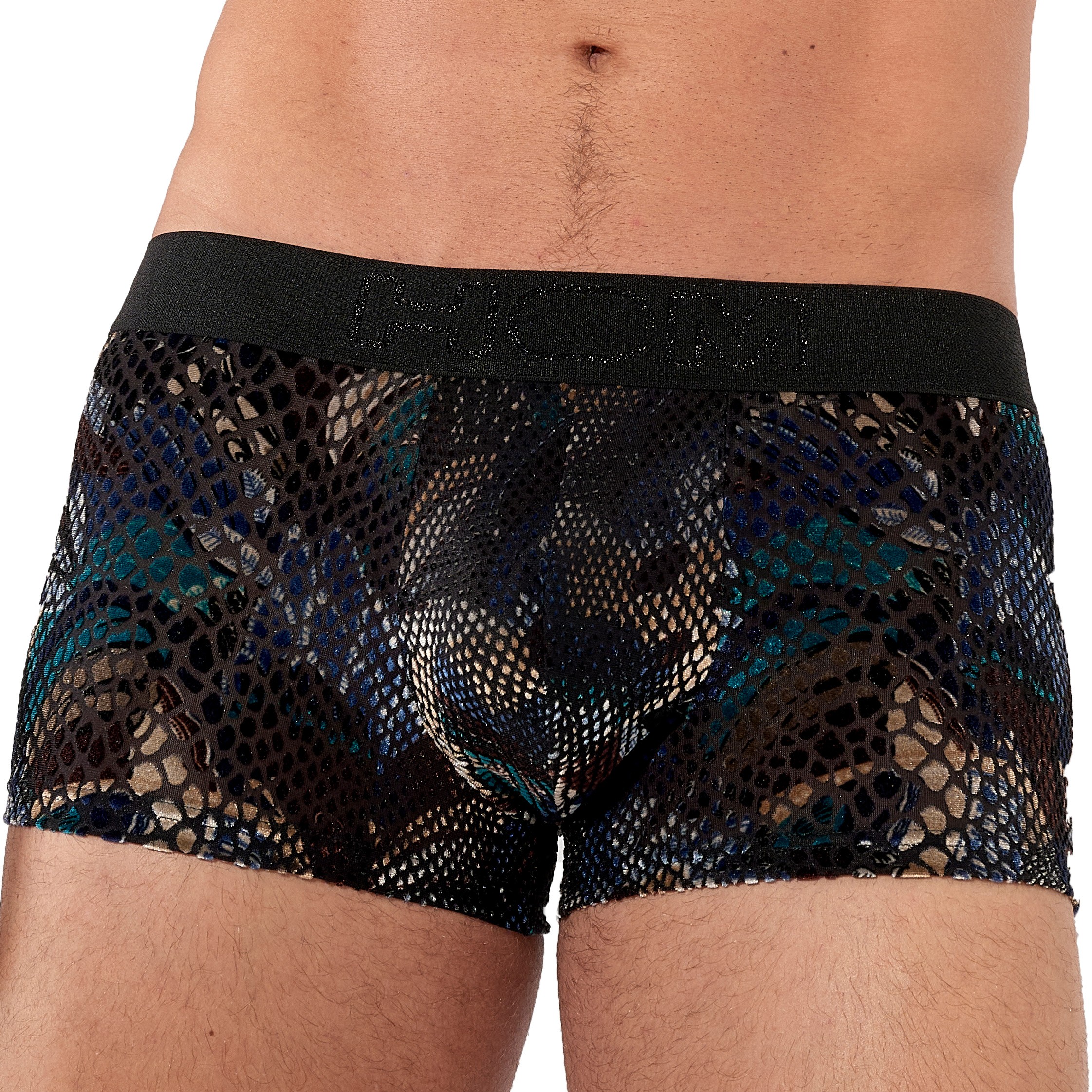 Le boxer homme COBRA adopte une coupe shorty courte, idéale pour mettre en valeur la silhouette masculine tout en garantissant une grande liberté de mouvement. Cette pièce de lingerie homme intègre un voile de bas de jambe insérédans la couture – un ourlet finement élastiqué – qui assure un excellent maintien sans marquer la peau, tout en maintenant le sous-vêtement en place tout au long de la journée. Ce boxer sexy pour homme est conçu en polyester et microfibre, avec une doublure intérieure en polyester pour un confort au porté accru. Mais c’est surtout sa finition en velours dévoré qui fait toute la différence : ce procédé textile révèle un subtil jeu de motifs effet peau de serpent, entre transparence, reflets et relief, évoquant à la fois l’érotisme chic et l’extravagance. Fluide, doux et légèrement satiné, ce tissu épouse le corps avec souplesse, pour une sensation à fleur de peau. Le style du boxer lingerie COBRA marie l’audace et le raffinement : ses couleurs chatoyantes, ses effets de texture et ses motifs animaliers évoquent un univers résolument affirmé. La ceinture élastique, discrètement logotypée HOM en fils lurex, ajoute une touche précieuse et luxueuse sans sacrifier le confort. Pensé comme une pièce de lingerie pour homme, le boxer COBRA est un sous-vêtement sexy qui assume pleinement son style : affirmé, élégant, sensuel.