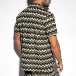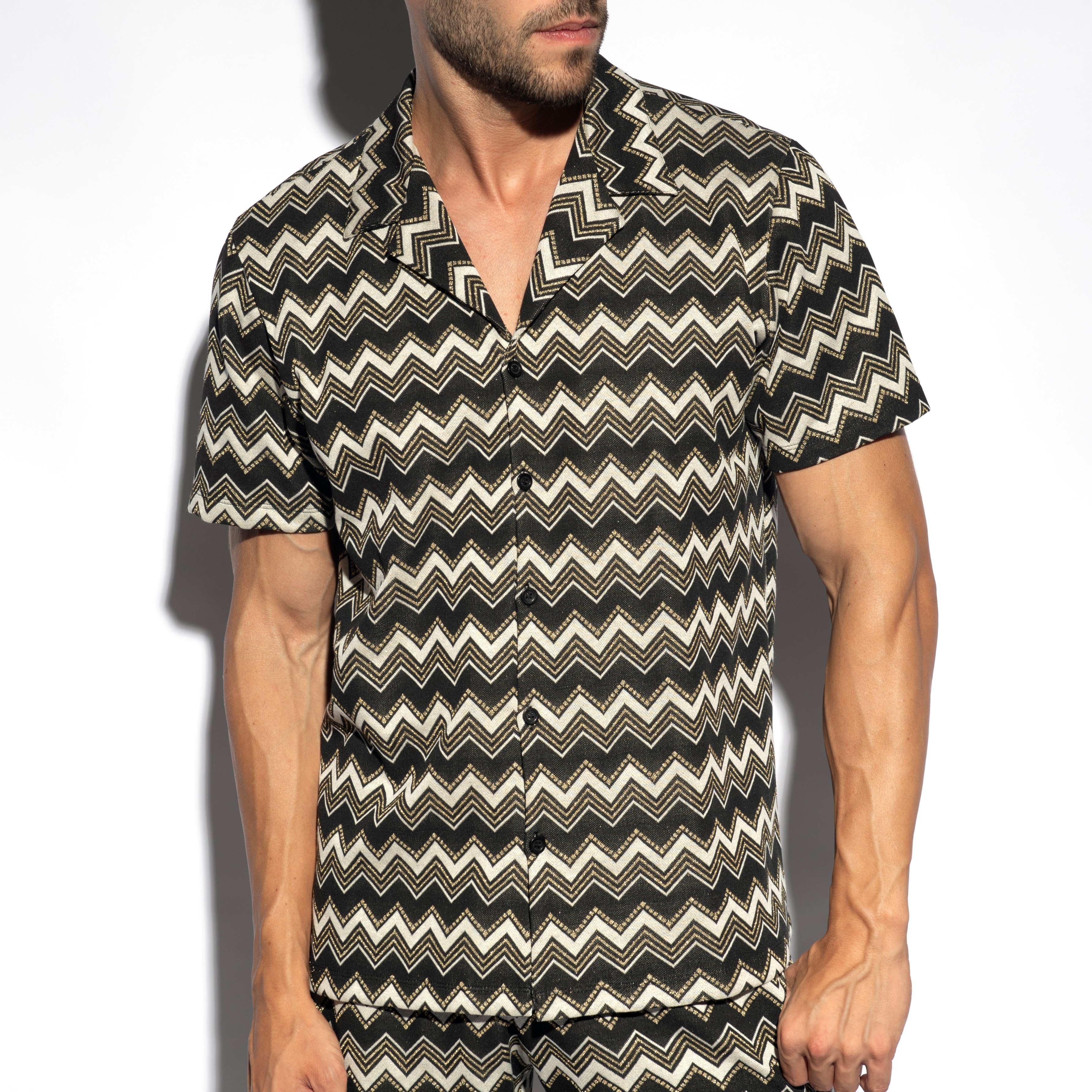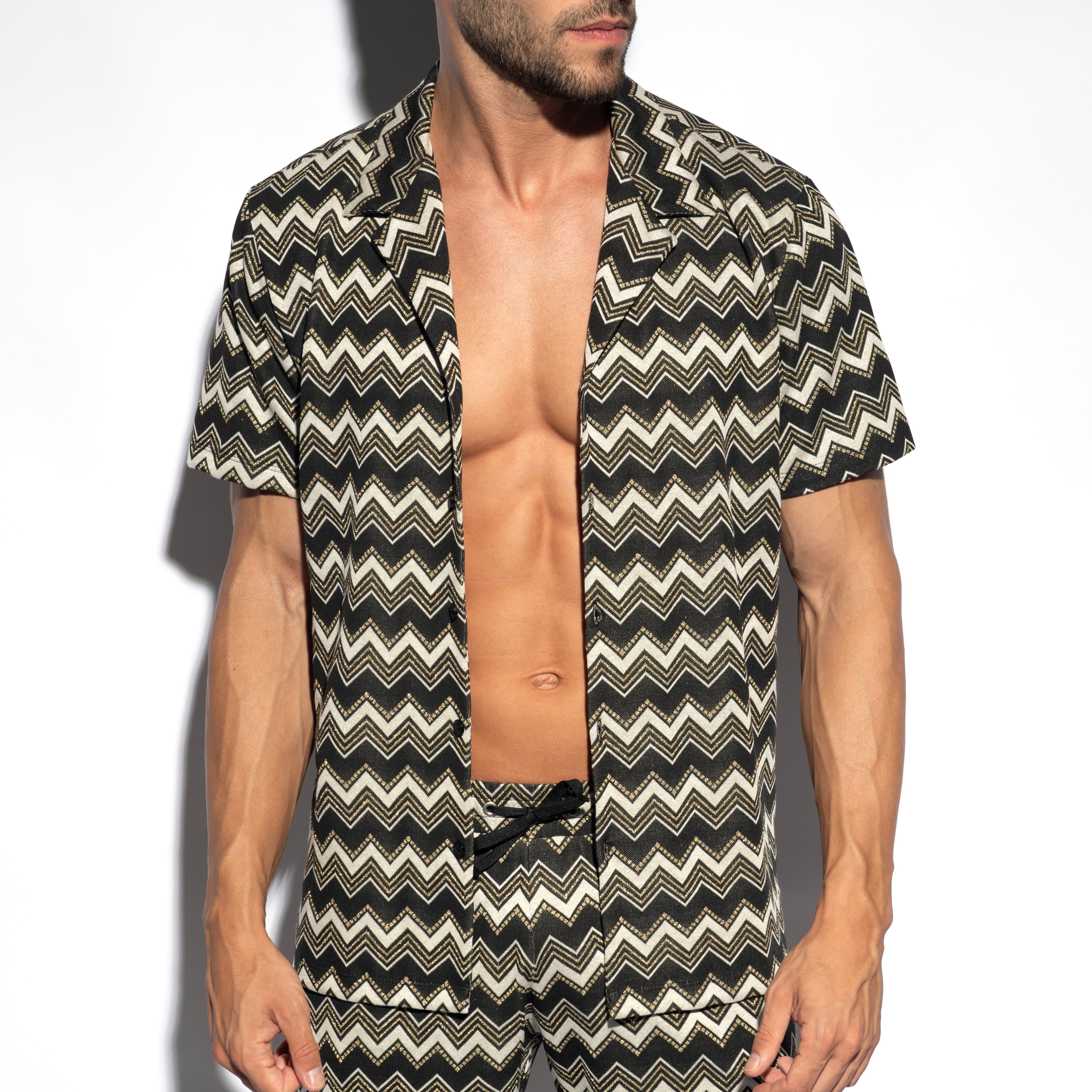 Royal AF. C’est décontracté... mais fait Royal - avec un ethos de design classique exquis entrelacé de fil métallique doré. Chemise boutonnée vraiment surélevée qui a un motif de vagues fortes avec des lignes dorées solides et un design mini-bloc partout, apportant un tout nouveau niveau de classe à votre garde-robe quotidienne. Il scintille et chatoie tellement qu’on dirait que tu étais habillé dans un château de fantaisie : simplement scintillant à chaque mouvement. Le tissu magnifique et de style plus épais a un effet super-extensible, permettant une adaptation parfaite tout en brillant des fils dorés supplémentaires cachés sous les couleurs à rayures alternées. Col moderne de style veste avec boutons en plastique coordonnés de couleur tout le long du devant.