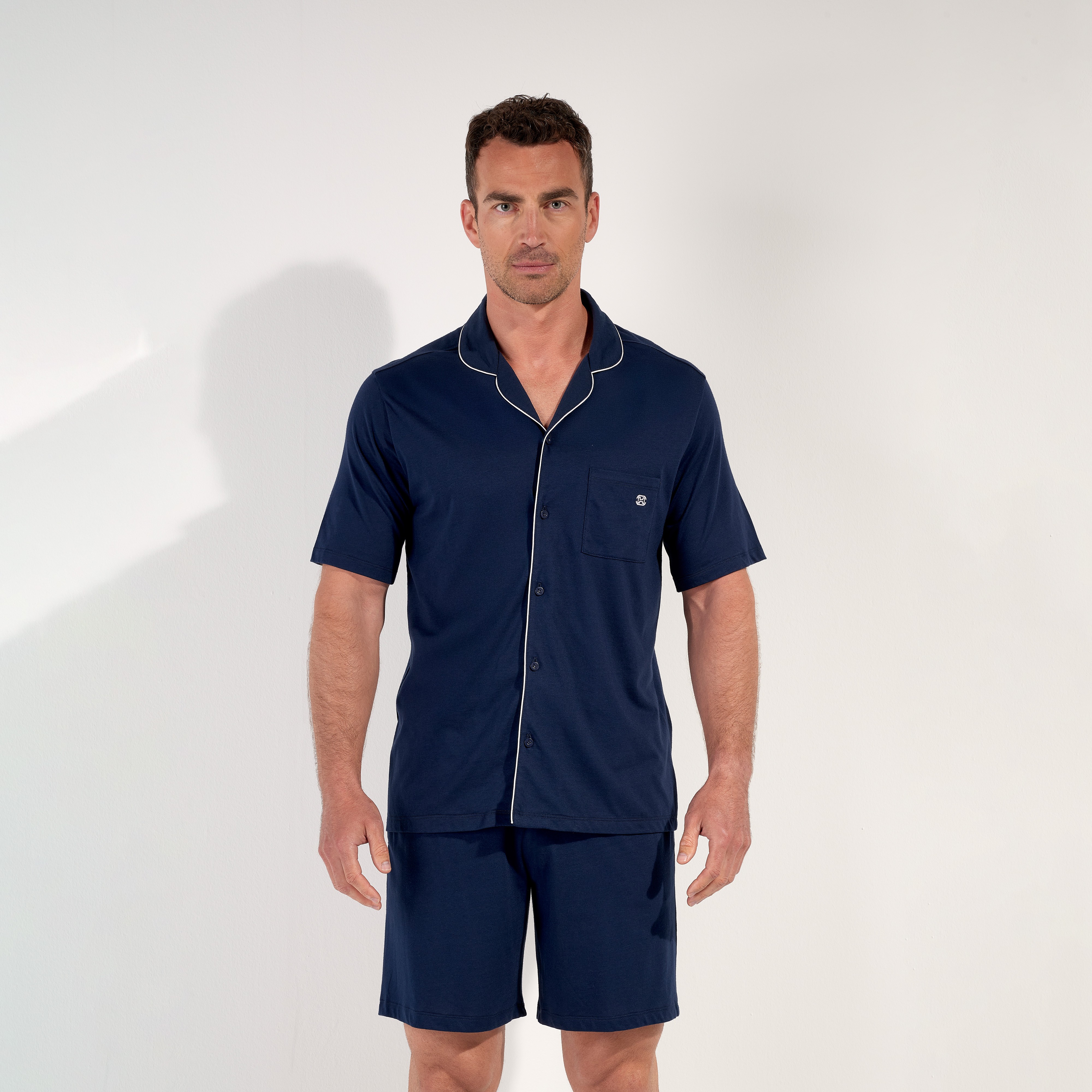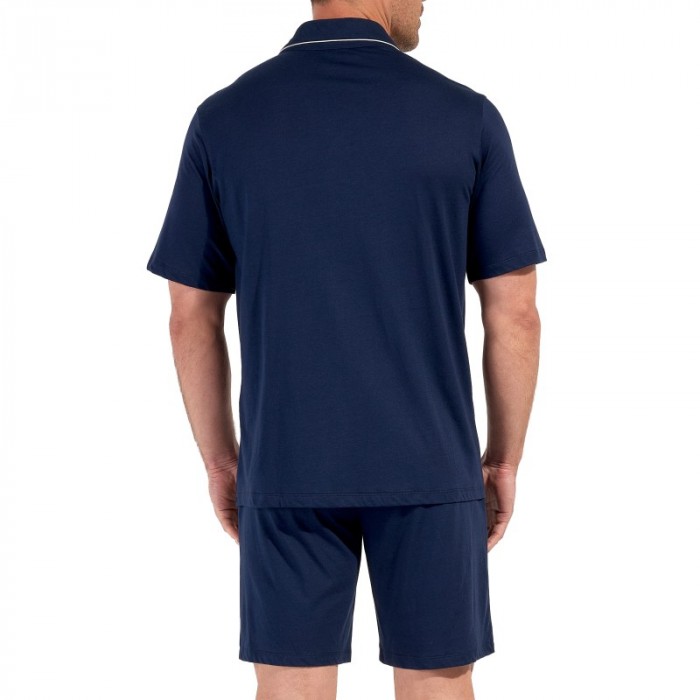 Le pyjama court homme Rafael incarne l’élégance décontractée de la maison HOM. Confectionné en coton et modal, il offre une douceur exceptionnelle et une légèreté idéale pour la détente à la maison. Sa coupe raffinée associe un short fluide à une chemise à manches courtes, boutonnée sur l’avant avec des boutons gravés HOM. Le coloris bleu nuit profond, rehaussé d’un passepoil contrasté et d’une poche plaquée brodée, apporte une touche subtile sophistiquée. À la fois respirant et agréable sur la peau, ce pyjama court pour homme deux pièces assure un confort absolu, que ce soit pour dormir ou simplement se relaxer avec style.