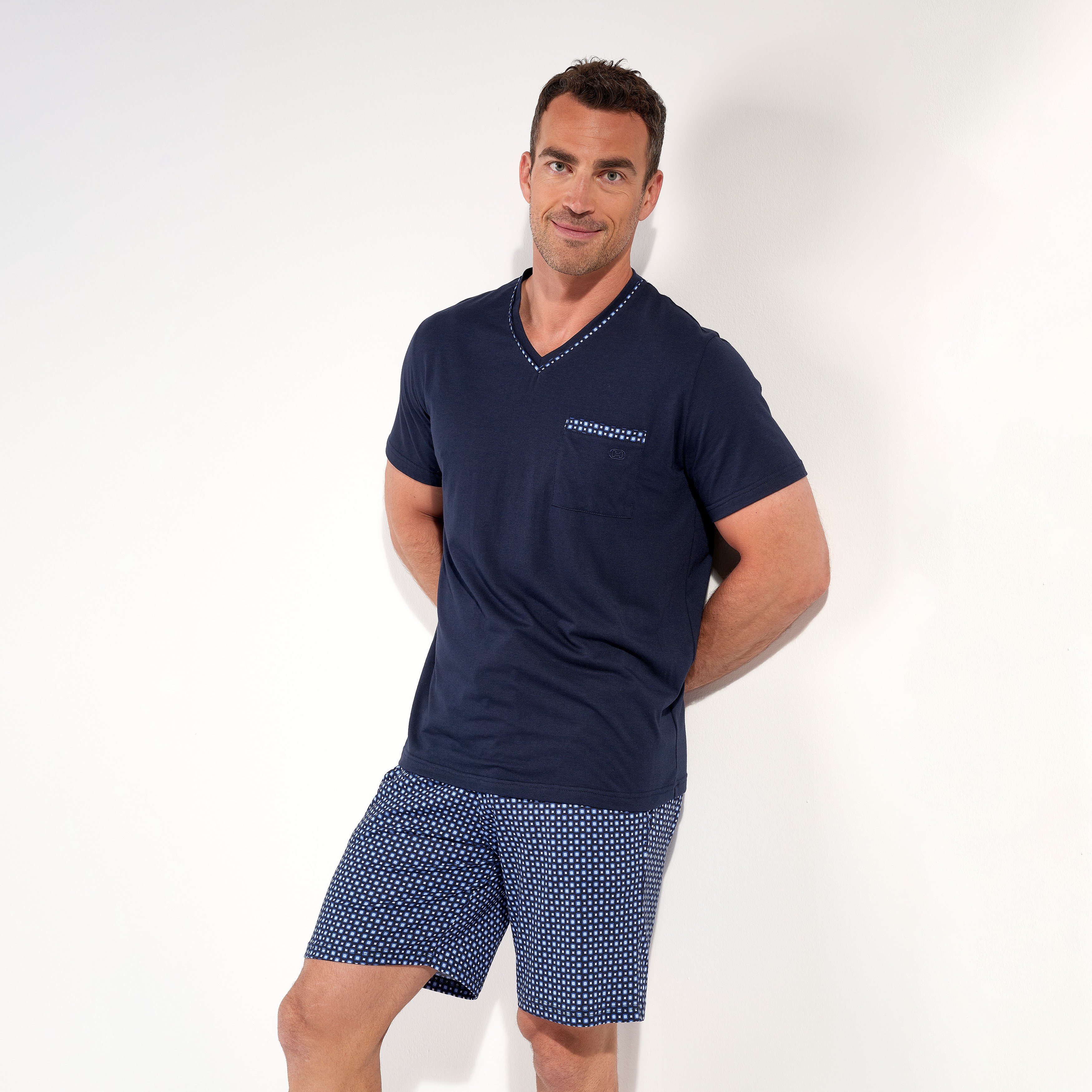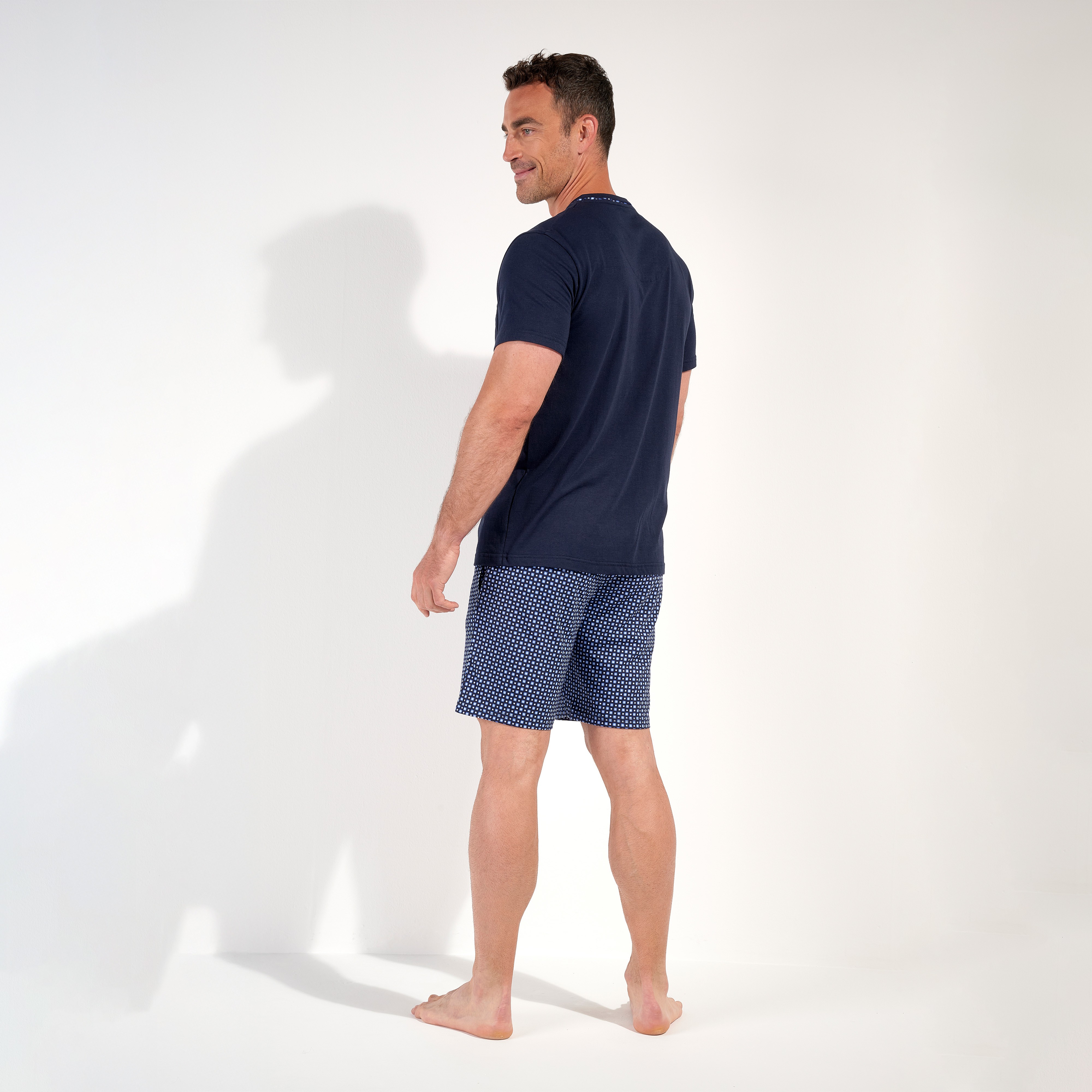 Le bas de ce pyjama court pour homme est un short droit, uni bleu marine. Il présente deux poches côtés dans les coutures latérales.