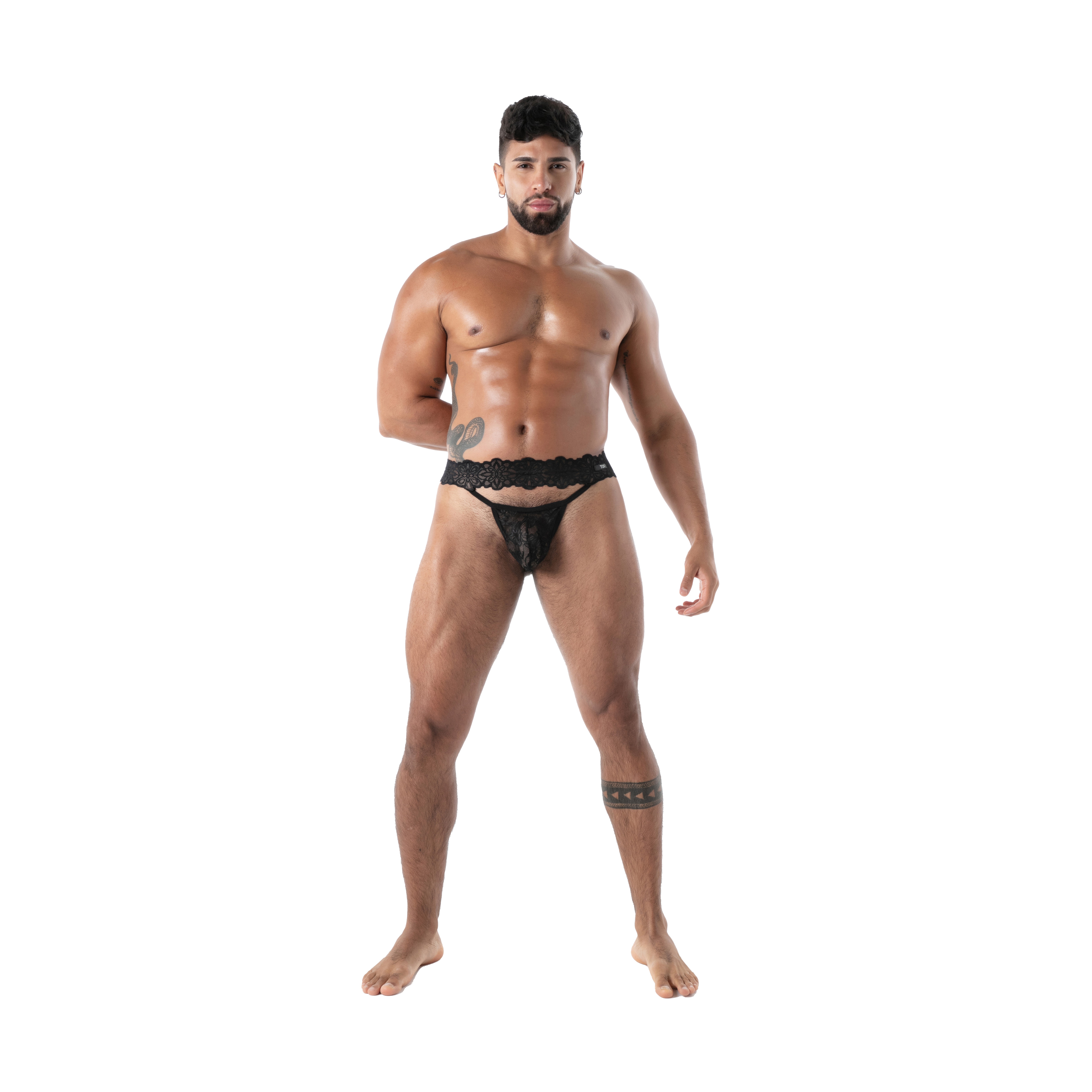 String sexy homme en dentelle fluide noir, ceinture fine et ficelle élastique au dos. Poche frontale innovante avec contour élastique. Logo TOF Paris cousu. Conçu à Paris, lavable à 30 °C.