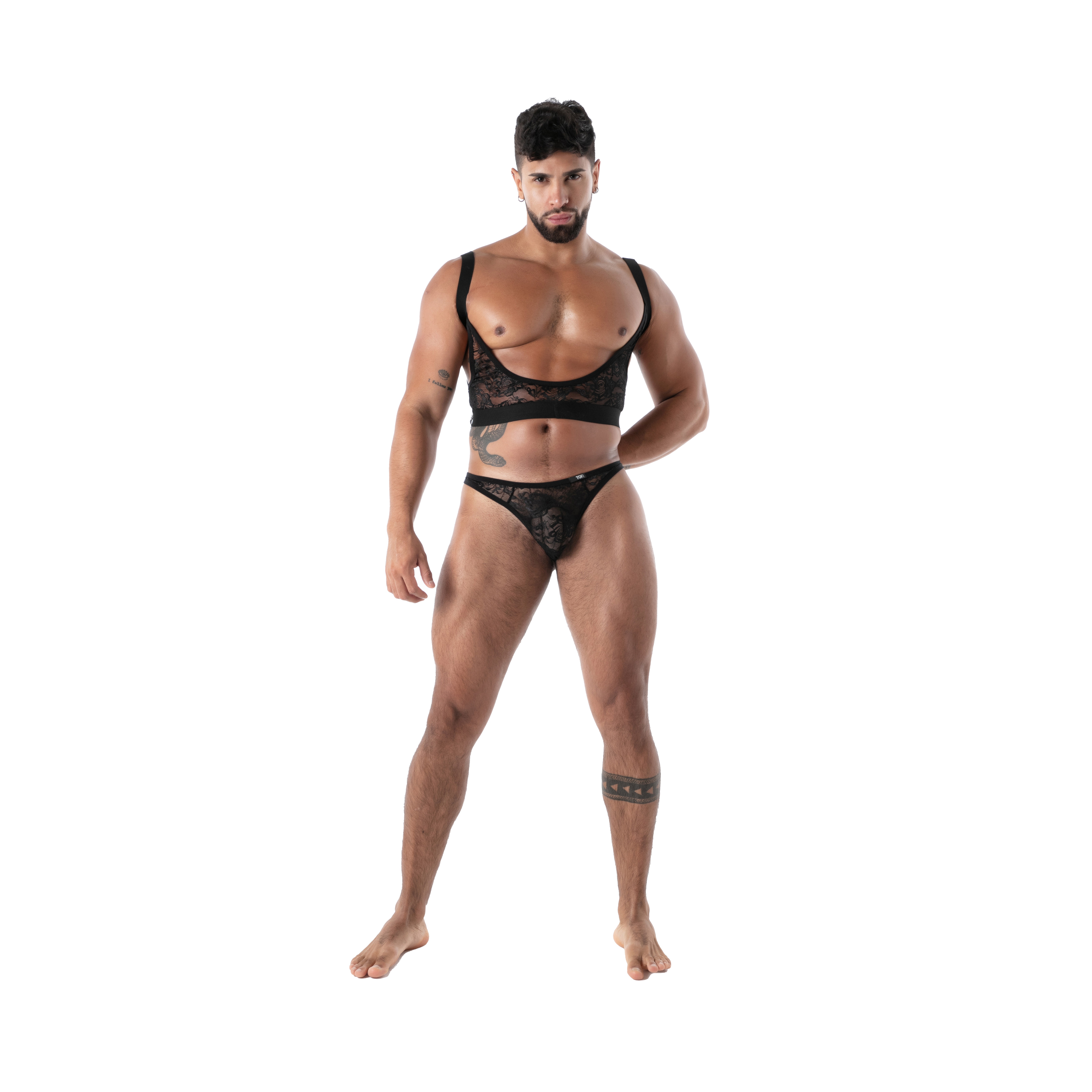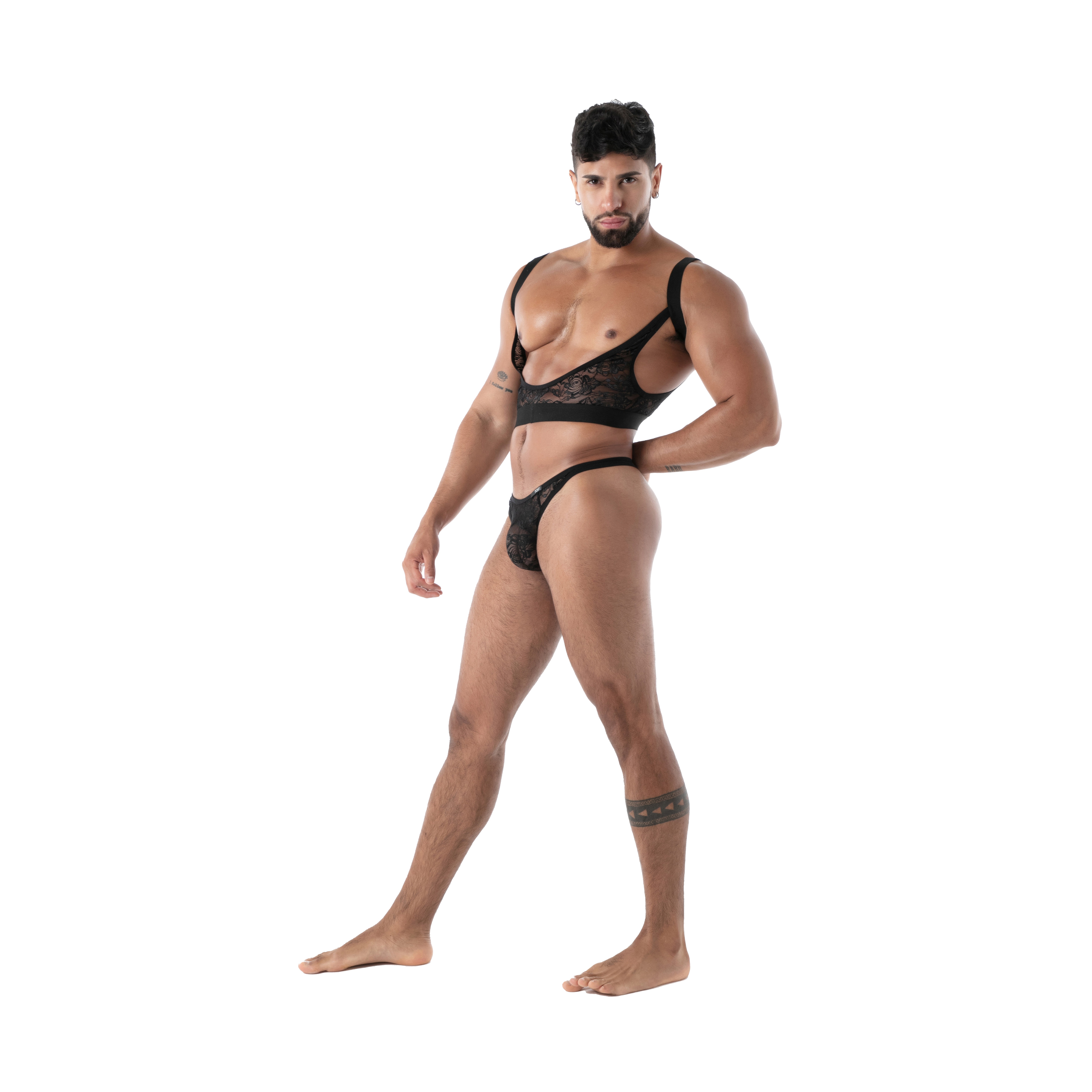 turn up the heat with this black lace thong bodysuit, a sensual piece by TOF Paris, designed to sublimate the male body. Its slimming cut emphasizes the lines of the torso, while the thong finish reveals just the right place, where it is needed.