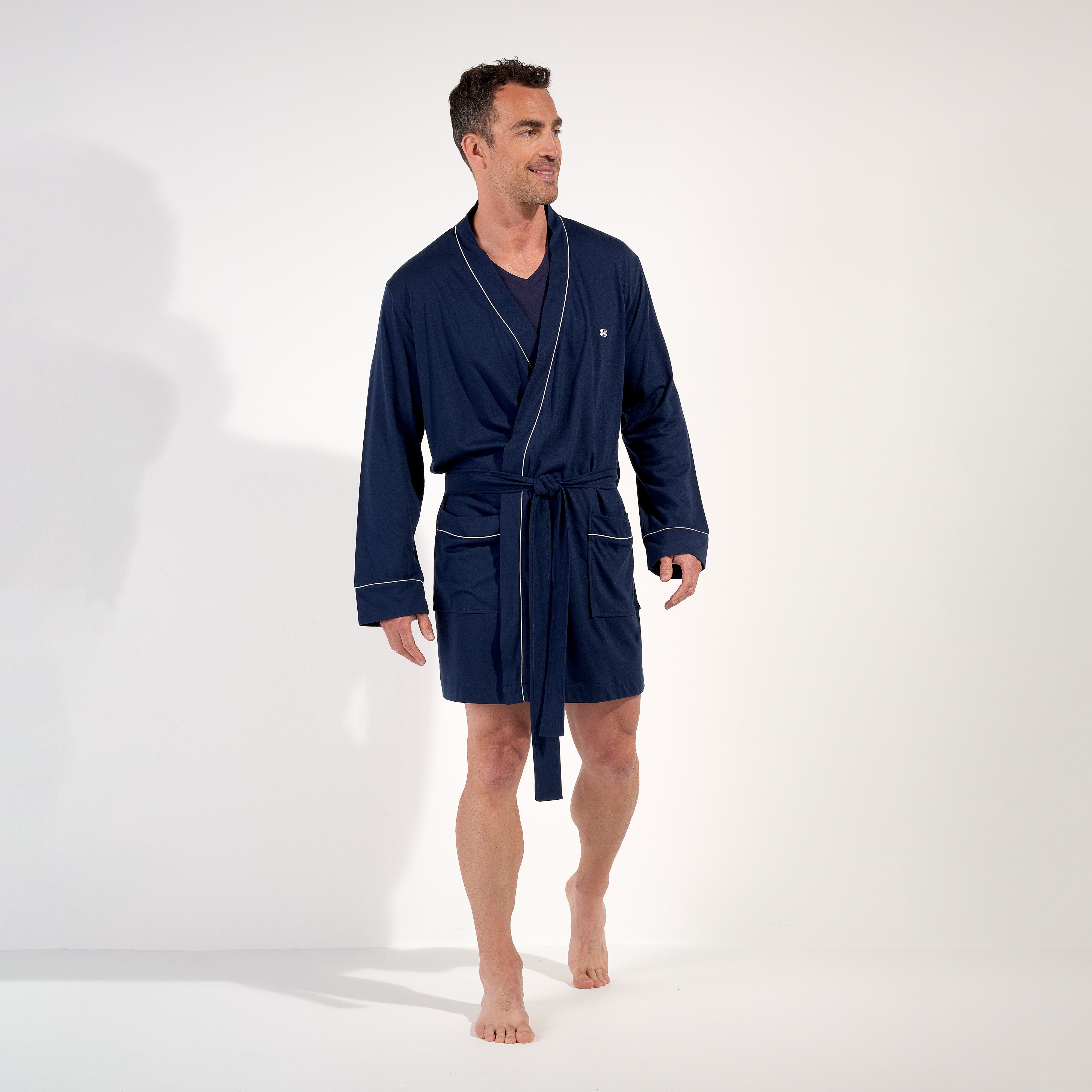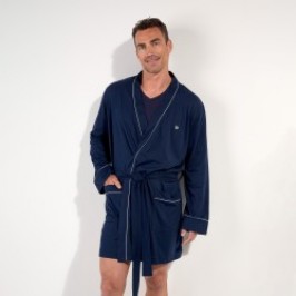 The Rafael men's cropped kimono revisits men's loungewear in a modern and sophisticated version. Made of a blend of cotton and modal, it offers a fluid and silky material, with remarkable comfort. The criss-cross cut ties at the waist for a snug fit, while embroidery on the chest and contrasting piping add an elegant touch. Its deep midnight blue color emphasizes the sobriety and refinement of this homewear piece, ideal for relaxing moments at home or getting up in the morning.