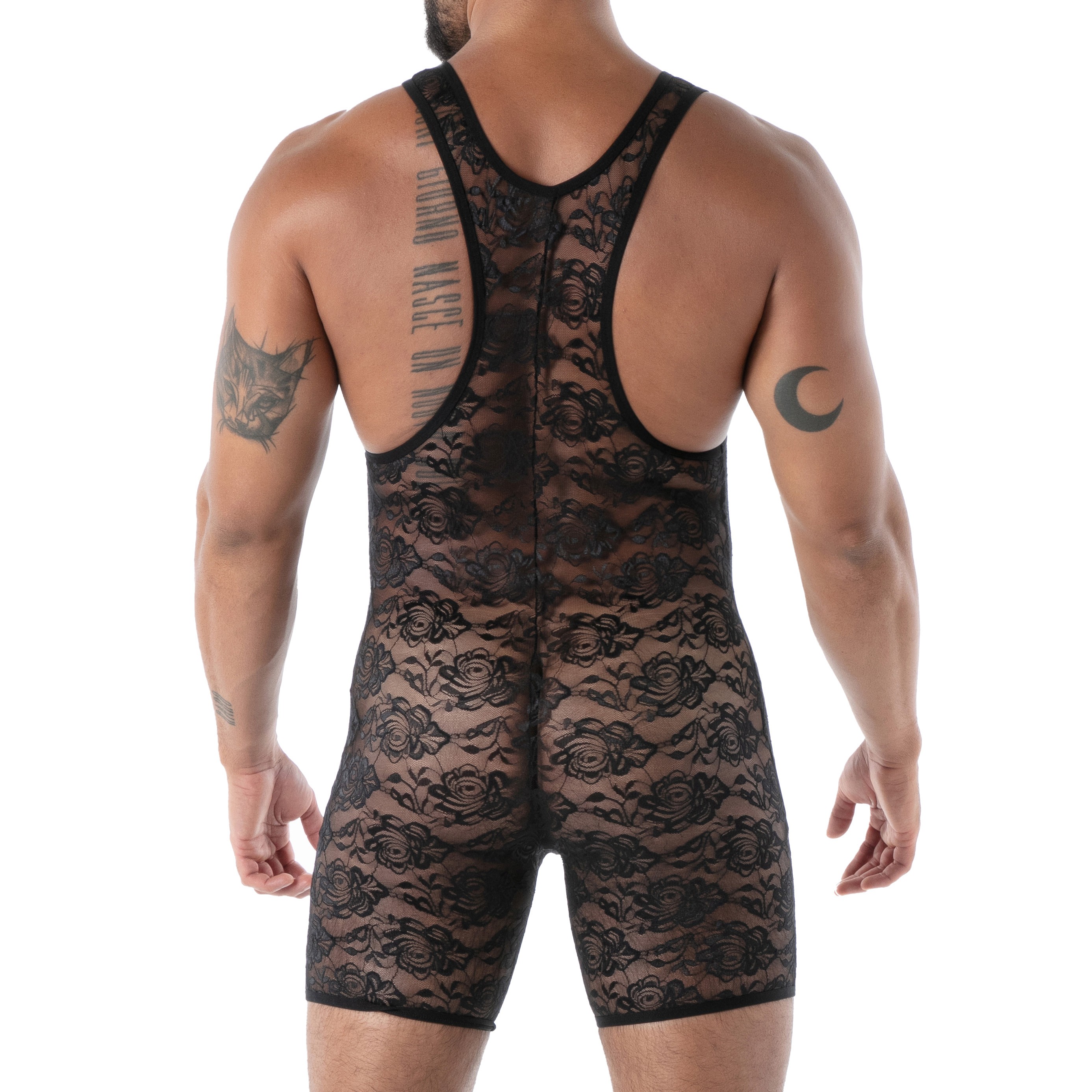 "This open wrestling bodysuit with lace pocket is an aesthetic and technical success. He manages to combine the virile aspect, with his wrestling-inspired cuts, with a touch of delicate eroticism thanks to the lace. I particularly appreciate the stitching details, the hold, and the balance between exposure and support. For me, it's a must-have for those who want to assert a sexy style."