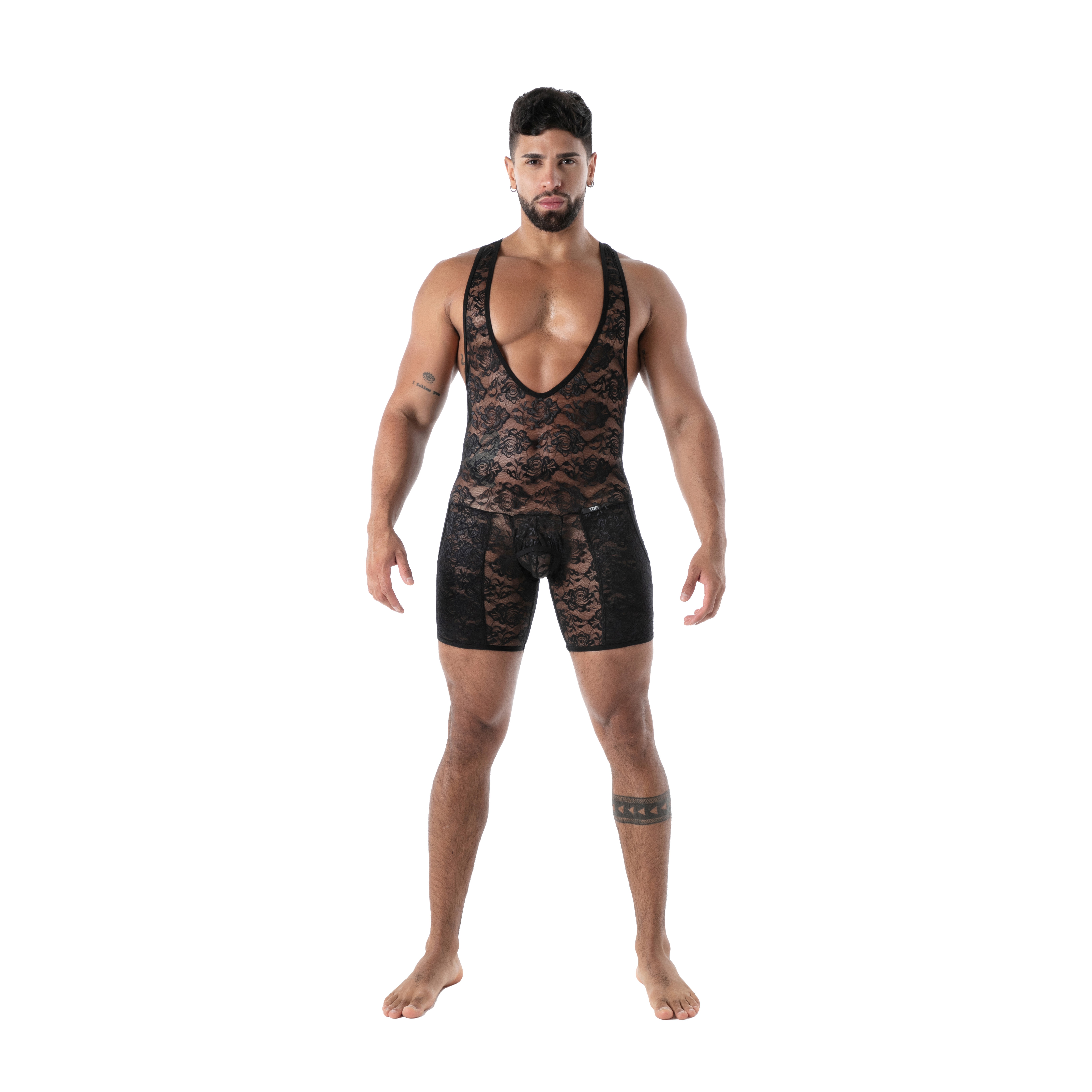Is he preparing to raise the temperature. Inspired by the raw and virile world of wrestling, this ultra-low-cut bodysuit revisits the codes of masculine sexy with crazy audacity. Designed and sewn in Paris, it hugs the body like a second skin, highlighting every muscle, every curve. Its black lace front pocket, delicately openworked, reveals just the right amount of time... and even more so thanks to its practical opening.