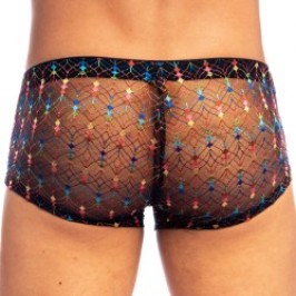 The REVIVAL Push-Up MiniBoxer reinterprets the men's shorty in a sensual and luminous version. Made of delicately transparent Italian black lace, it reveals its richness in contact with the skin, revealing small colorful square patterns scattered like confetti.
