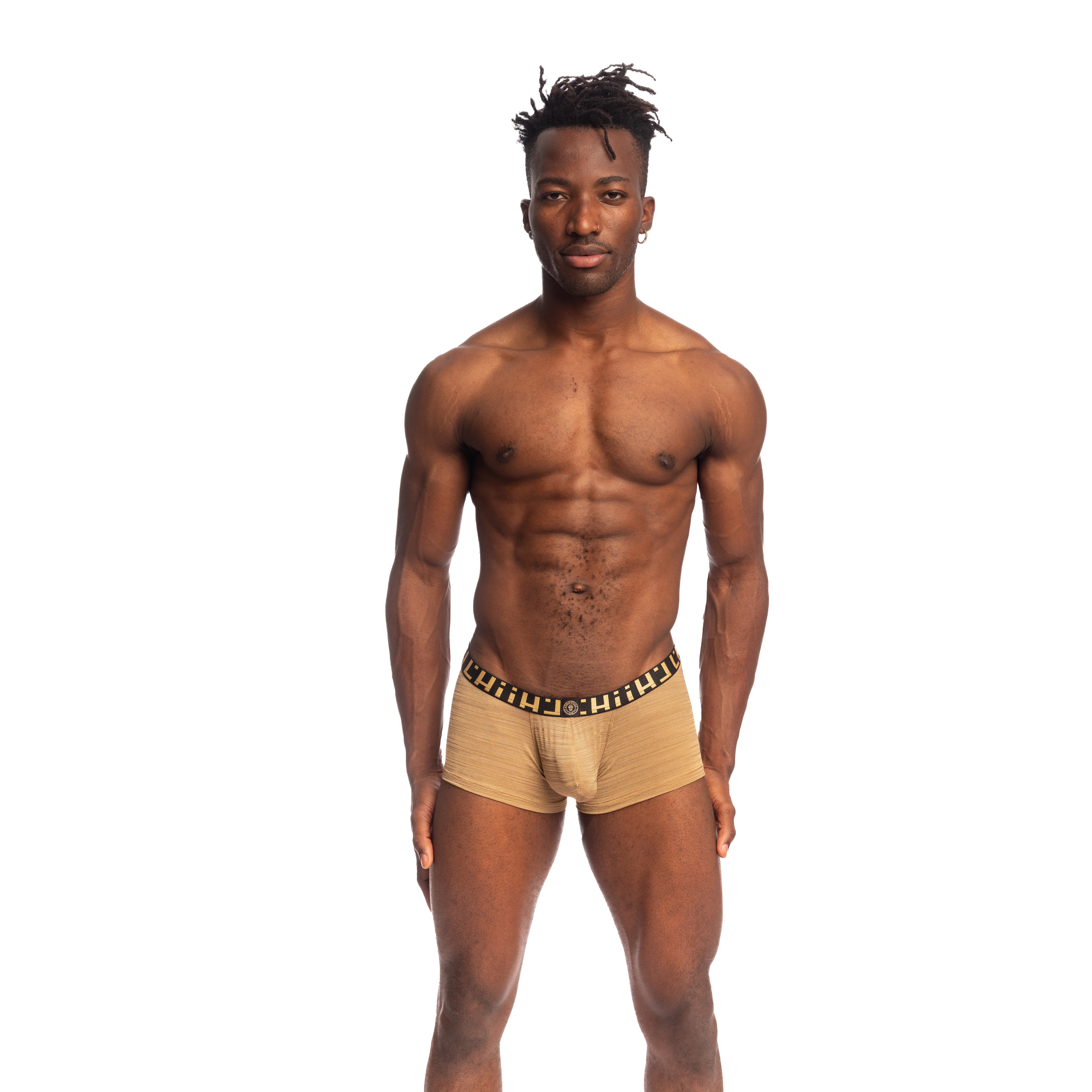 The two-tone elastic of these men's luxury boxer shorts is not just a decorative element. It participates in the structure of the garment, evenly distributing tension for optimal comfort without pressure points. The golden microfiber, woven with a premium density, offers remarkable resistance while maintaining an incomparable softness in contact with the skin. The push-up effect, achieved by a studied anatomical construction, naturally shapes without any visible artifice.