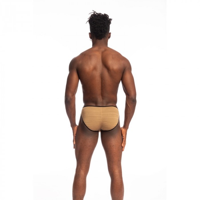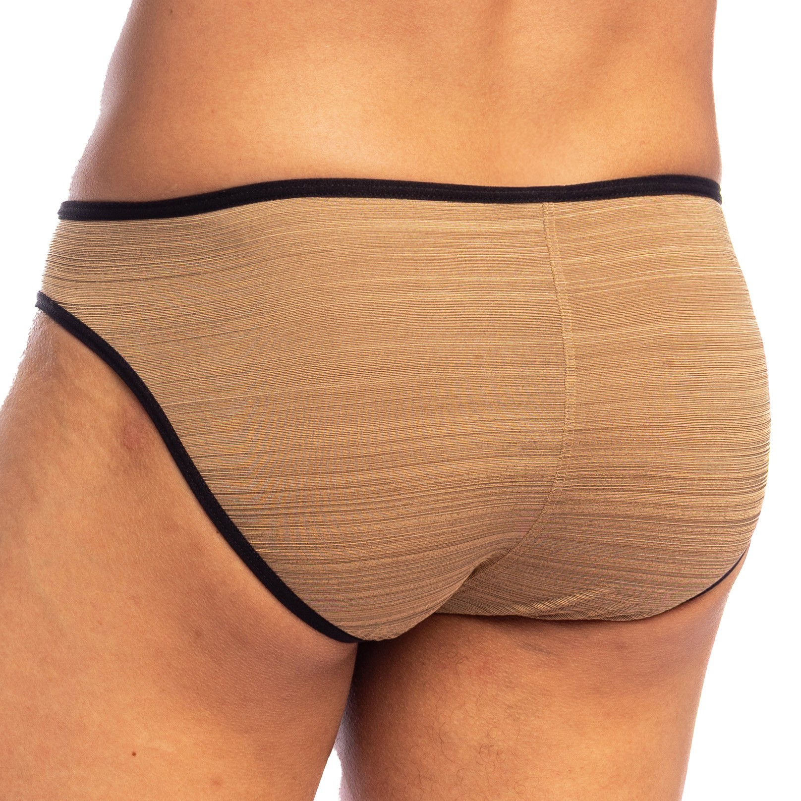 The microfiber used for these men's gold briefs offers exceptional properties: ultra-soft to the touch, breathable and thermoregulating, it accompanies your movements with perfect elasticity. The moiré effect, achieved by a sophisticated textile treatment, creates a unique visual depth that immediately distinguishes this high-end piece of lingerie. Black bias bindings are not just an aesthetic detail: they reinforce the structure of the garment and ensure optimal support without compression.