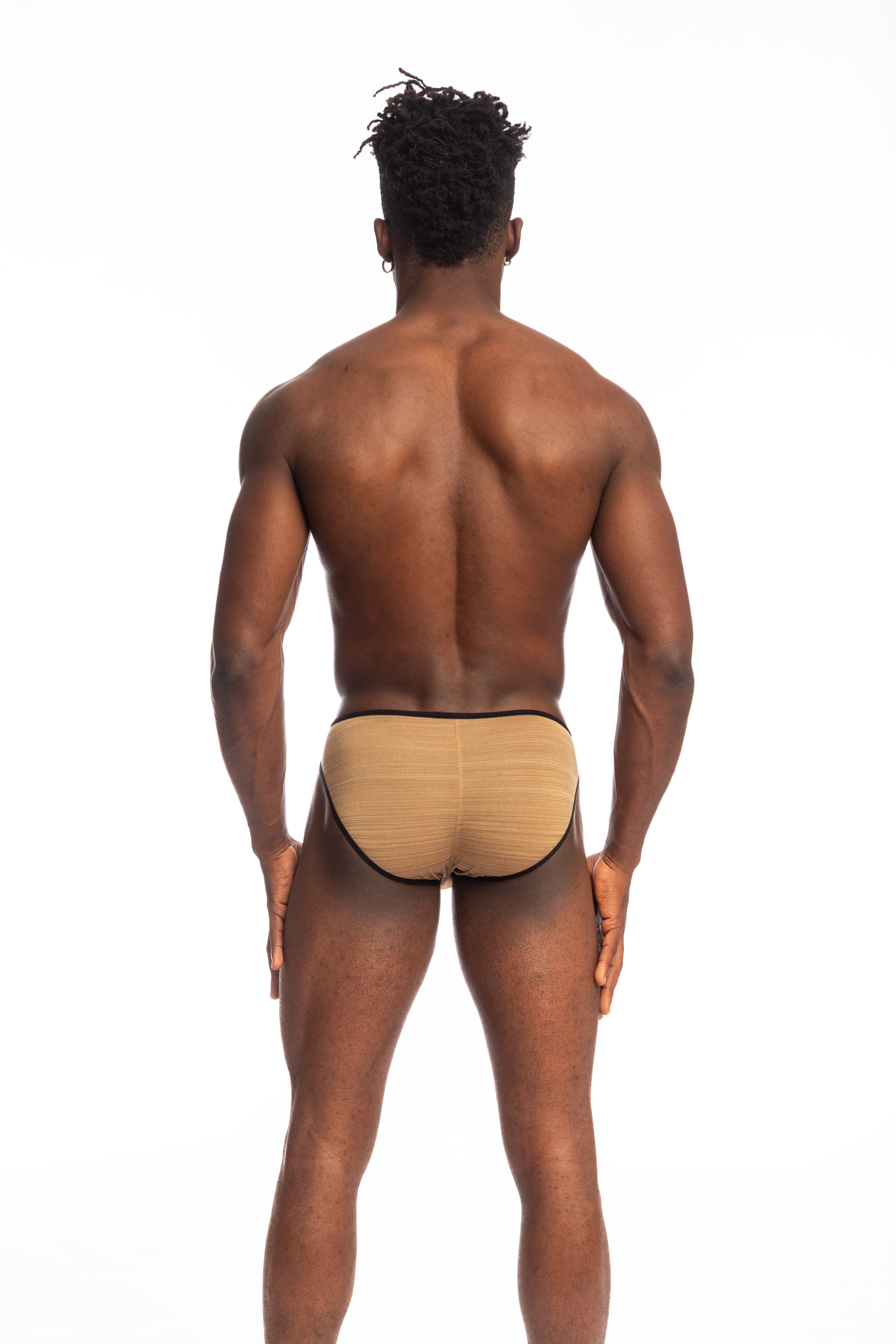 This designer men's underwear creation hugs the curves of the body thanks to its deeply indented cut. The premium microfiber offers an incomparable second-skin feel, while the invisible finishes guarantee total discretion under clothing. The golden reflection evokes the richness of the material, transforming the intimate into a territory of expression and style.