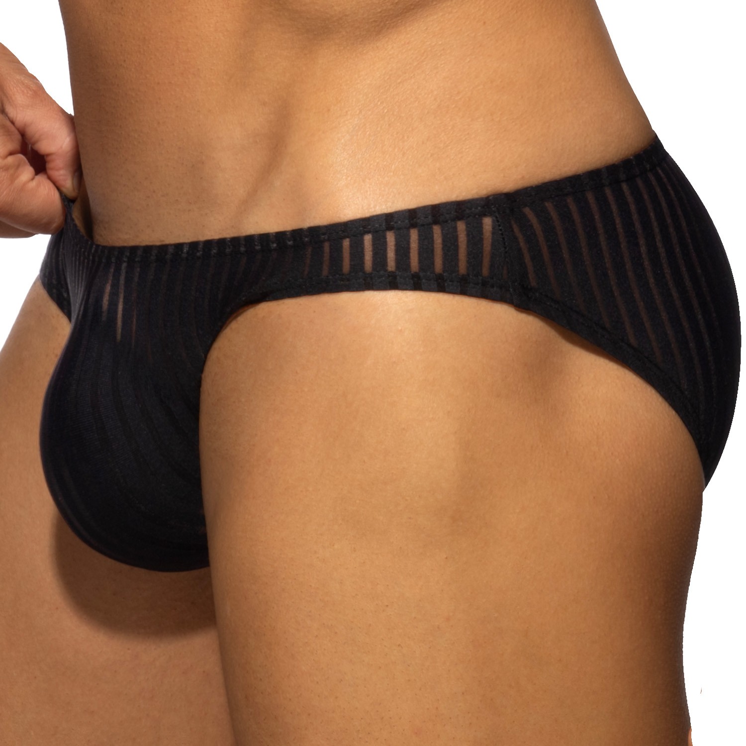 The side attachment system adds an alluring and practical touch, while the ergonomic front pocket supports without compressing. At the back, the cut subtly reveals and highlights the natural curve of the buttocks.