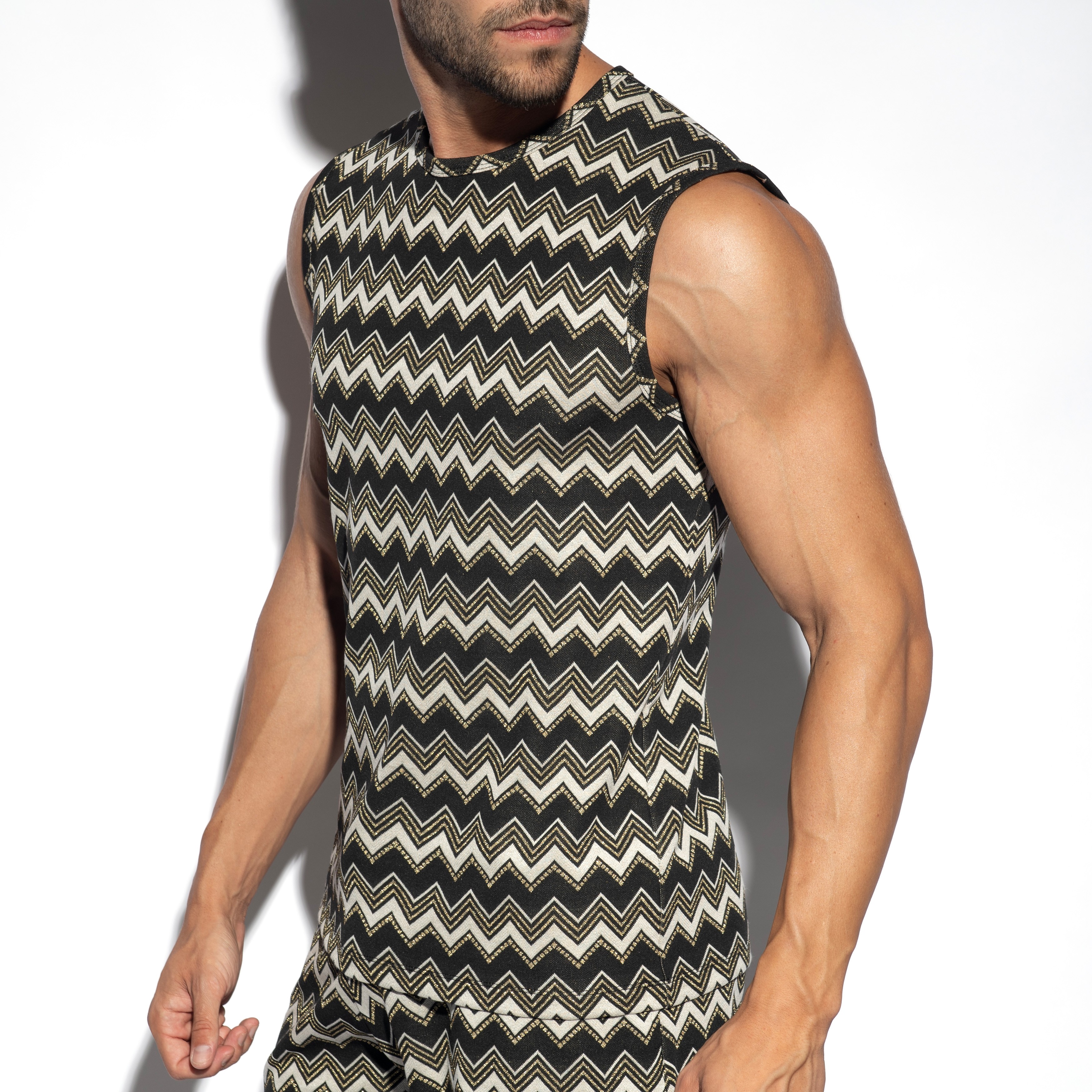 Crown Casuals. Because you deserve a crown! These are occasional everyday items that are elevated to an aristocratic level. A tank top that looks nothing like your average boring tank top - with an exquisite classic aesthetic intertwined with gold metallic threads. The fabric has a strong wavy pattern with solid gold lines and a mini-block design throughout, bringing a whole new level of class to your everyday wardrobe. It sparkles and shimmers so much that it looks like you were dressed in a fancy castle: simply glittering with every movement. The gorgeous, thicker-styled fabric has a super-stretchy effect, allowing for a perfect fit while shining extra golden threads hidden under the alternating striped colors.