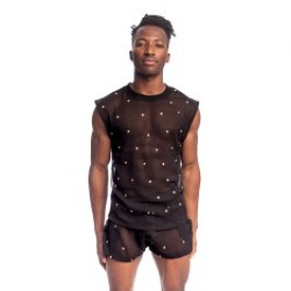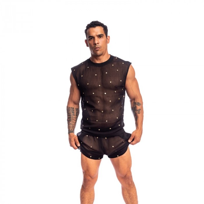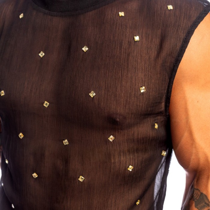 The Rain of the Stars Tank Top transcends the boundary between lingerie and couture fashion. More than a garment, it is a sensory experience: the airy feel of chiffon against the skin, the light of hand-sewn crystals that dance to the rhythm of the body, and the clean line that elegantly emphasizes the masculine silhouette.