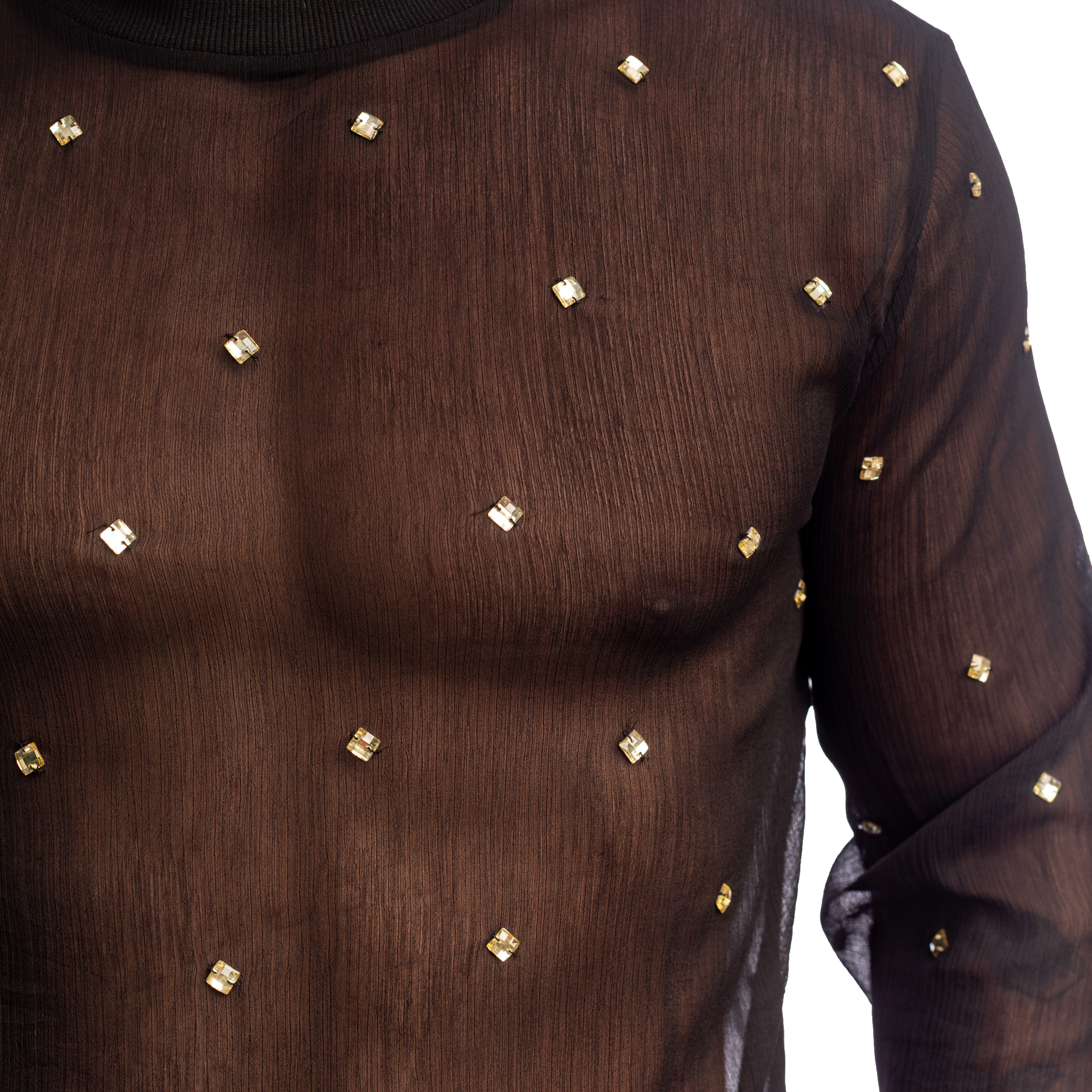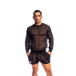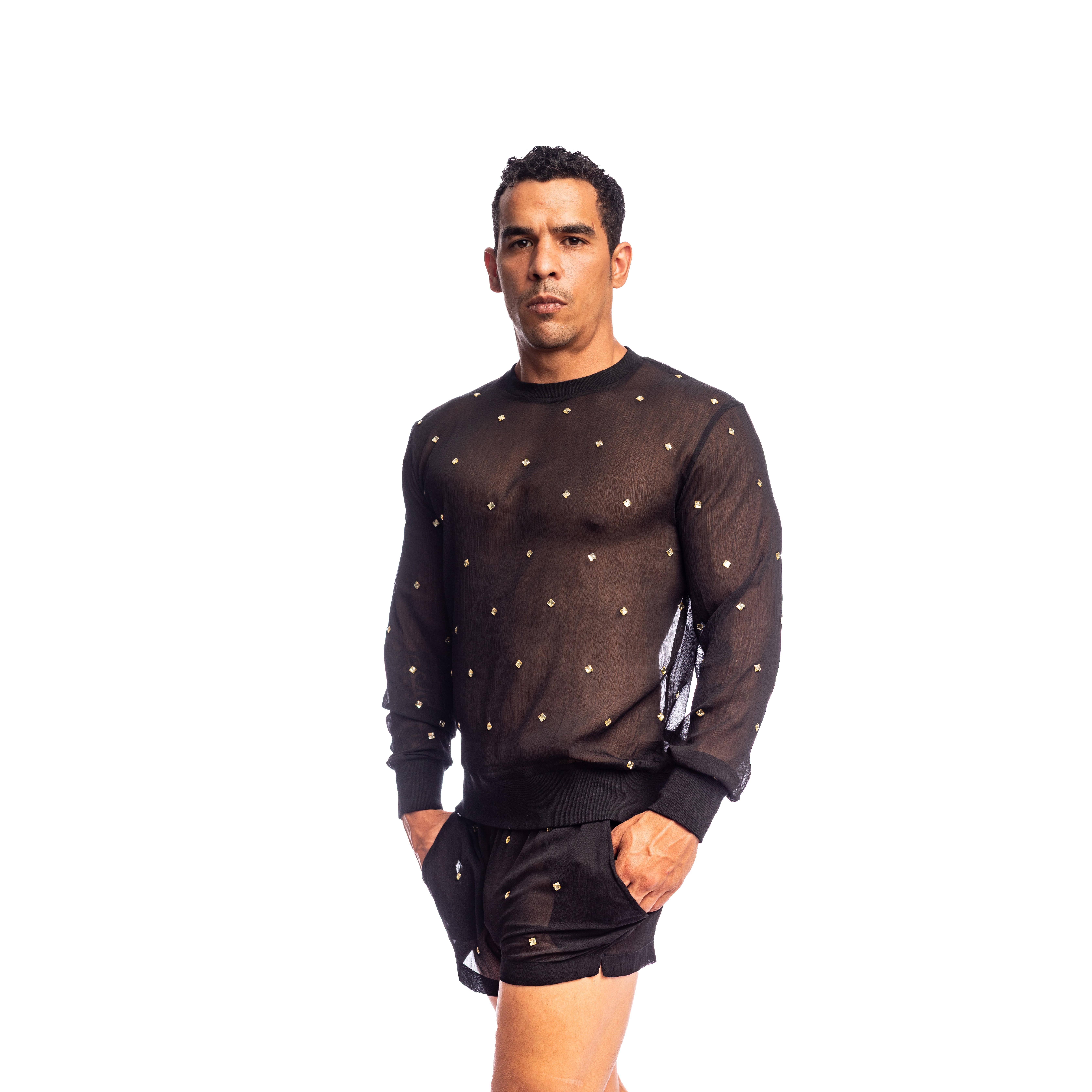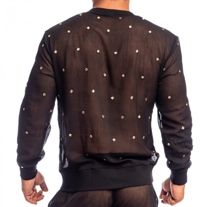 The Pluie des Étoiles long-sleeved top embodies the absolute refinement of men's couture fashion according to L'Homme Invisible. Crafted from sheer black chiffon, it is adorned with a constellation of hand-stitched crystals, shimmering with every movement like a summer sky illuminated by stars.