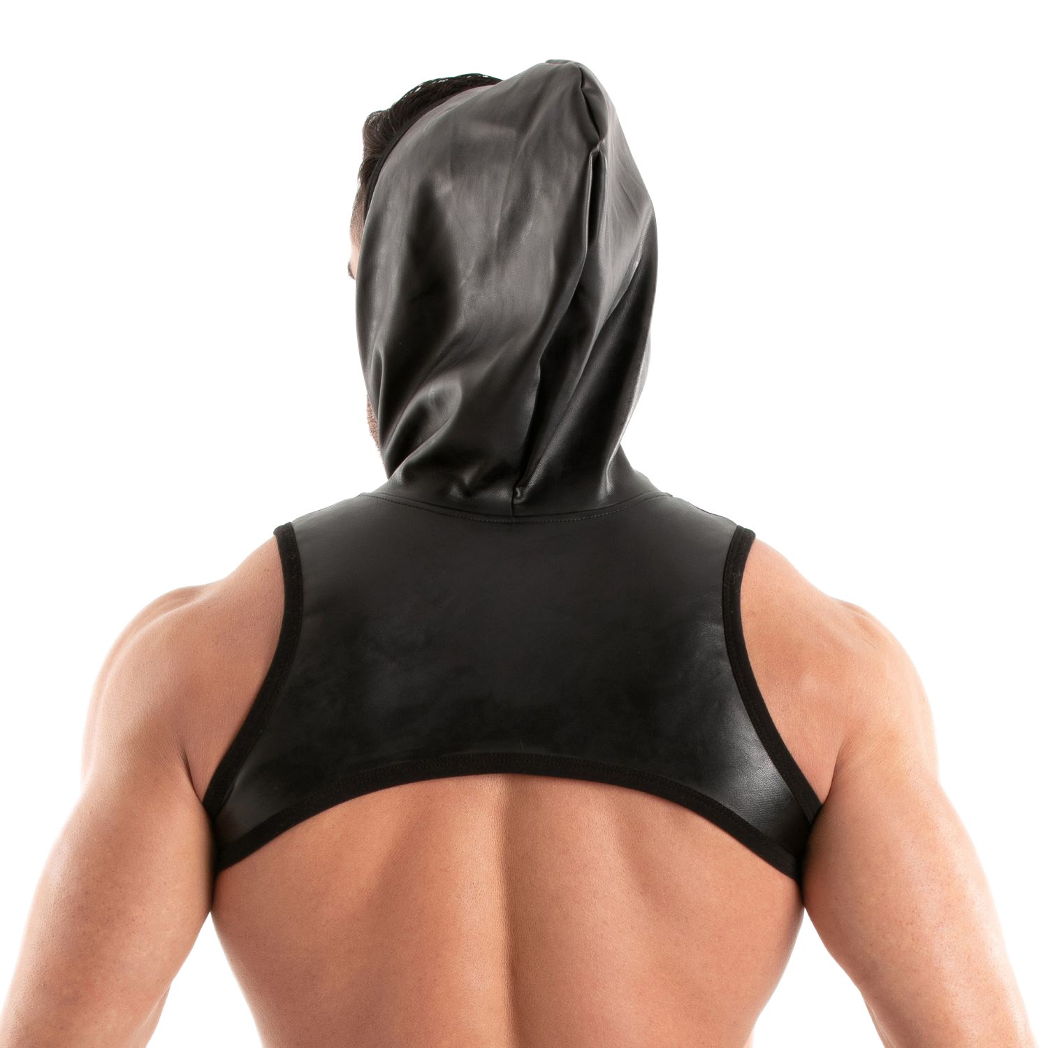 Questo modello ibrido tra imbracatura al torso e felpa stilizzata è l'espressione della moda maschile fetish che unisce comfort, sensualità e originalità. La tasca con cerniera anteriore è sia utile che grafica, e il cappuccio aggiunge un tocco di mistero particolarmente efficace.