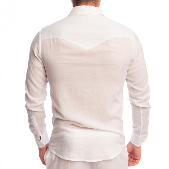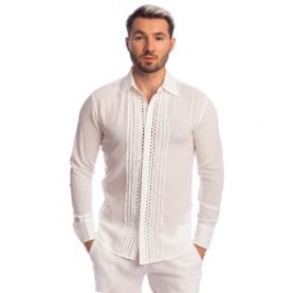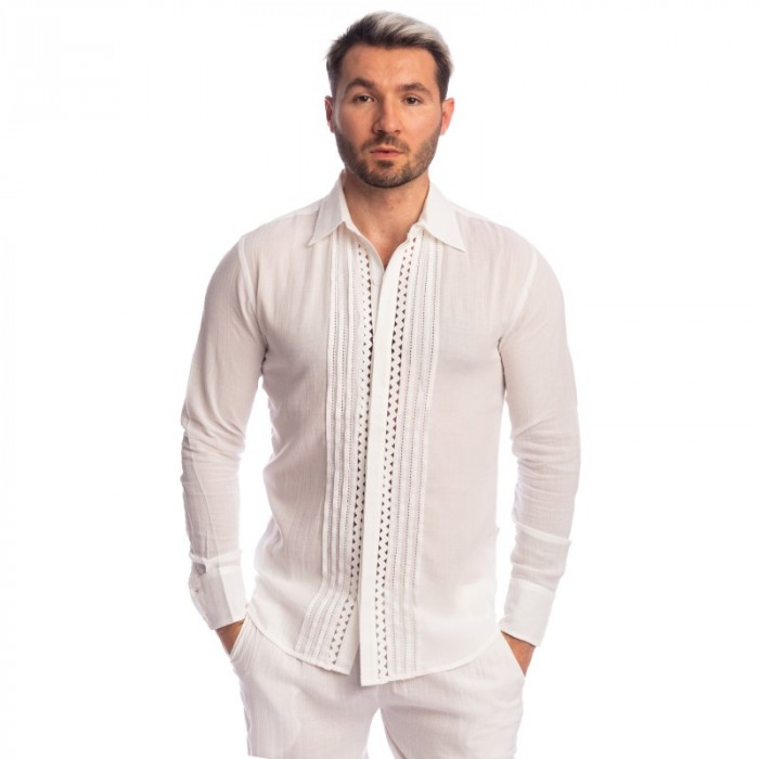 Camicia da uomo molto chic in Voile di cotone traforato e finissimo con dettagli e finiture preziose curata, la pelle si sublima sotto la discreta trasparenza della sua materiale morbido e vaporoso.